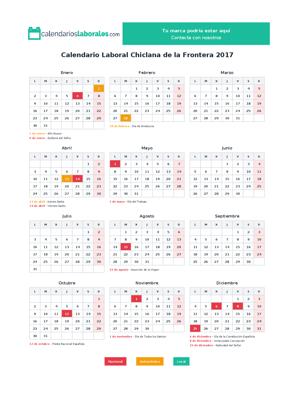 En 2017, 9 festivos nacionales se celebran en todo el territorio español, incluidos en el calendario laboral de Chiclana de la Frontera.