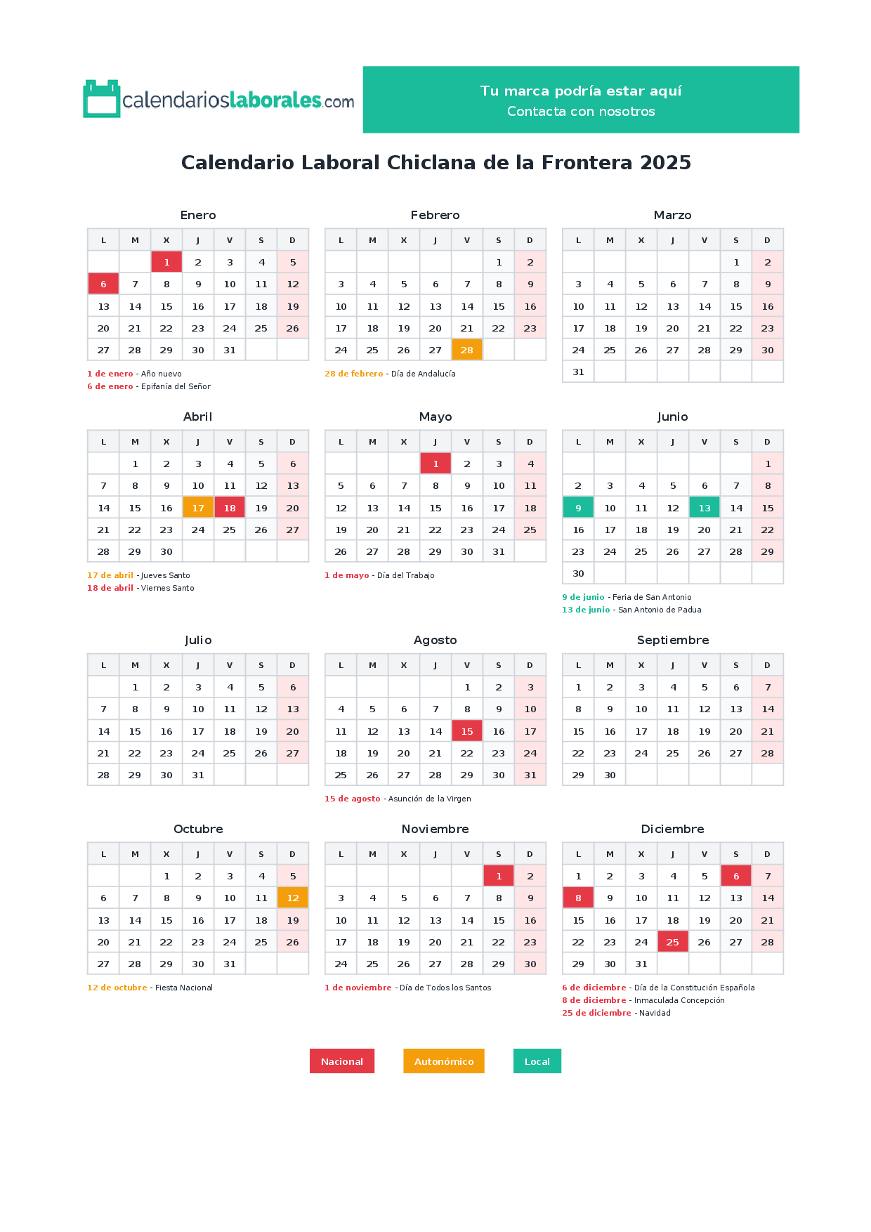 Además, el Ayuntamiento de Chiclana de la Frontera fija 2 festivos locales que completan el calendario laboral del municipio.