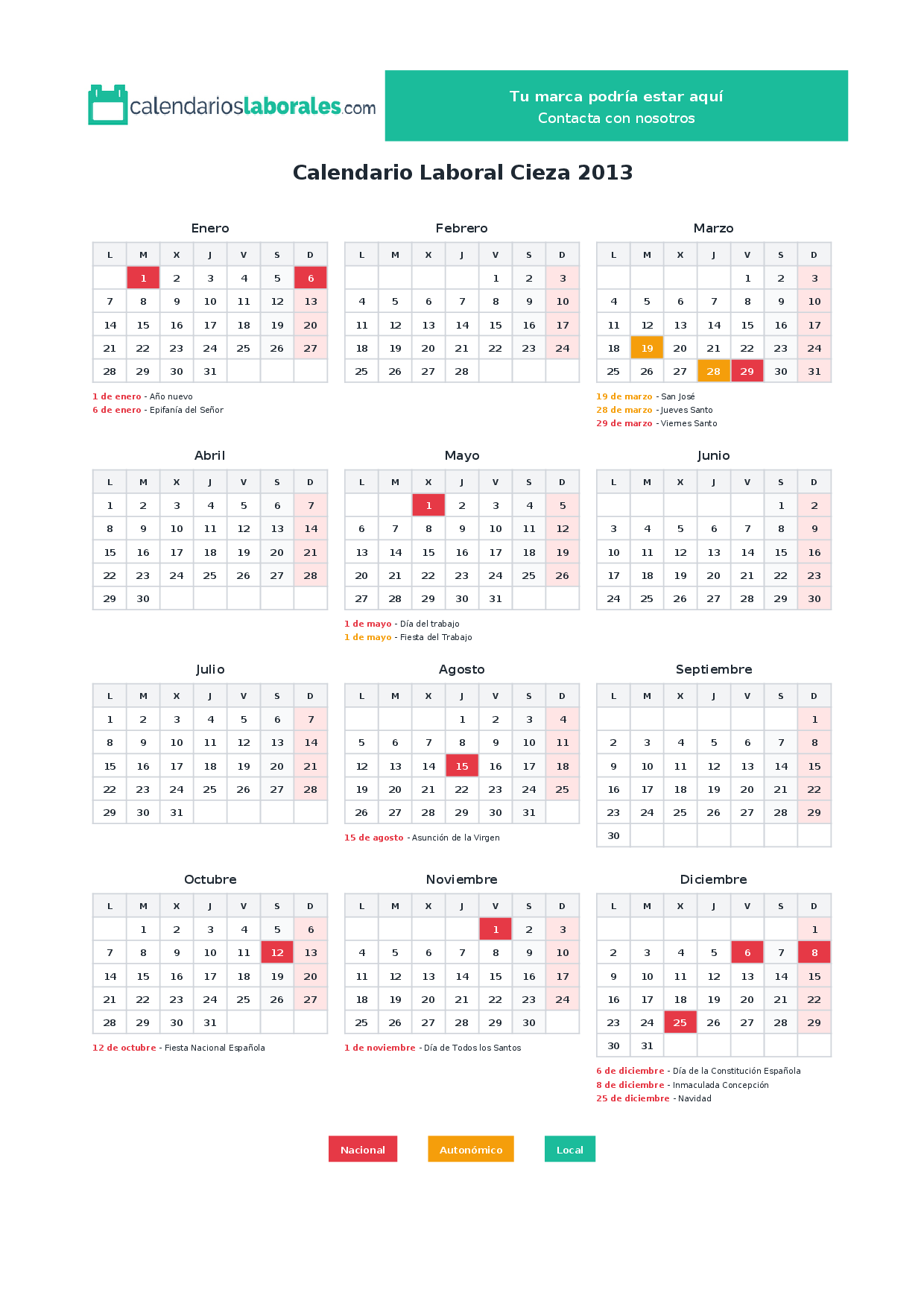 En 2013, 10 festivos nacionales se celebran en todo el territorio español, incluidos en el calendario laboral de Cieza.