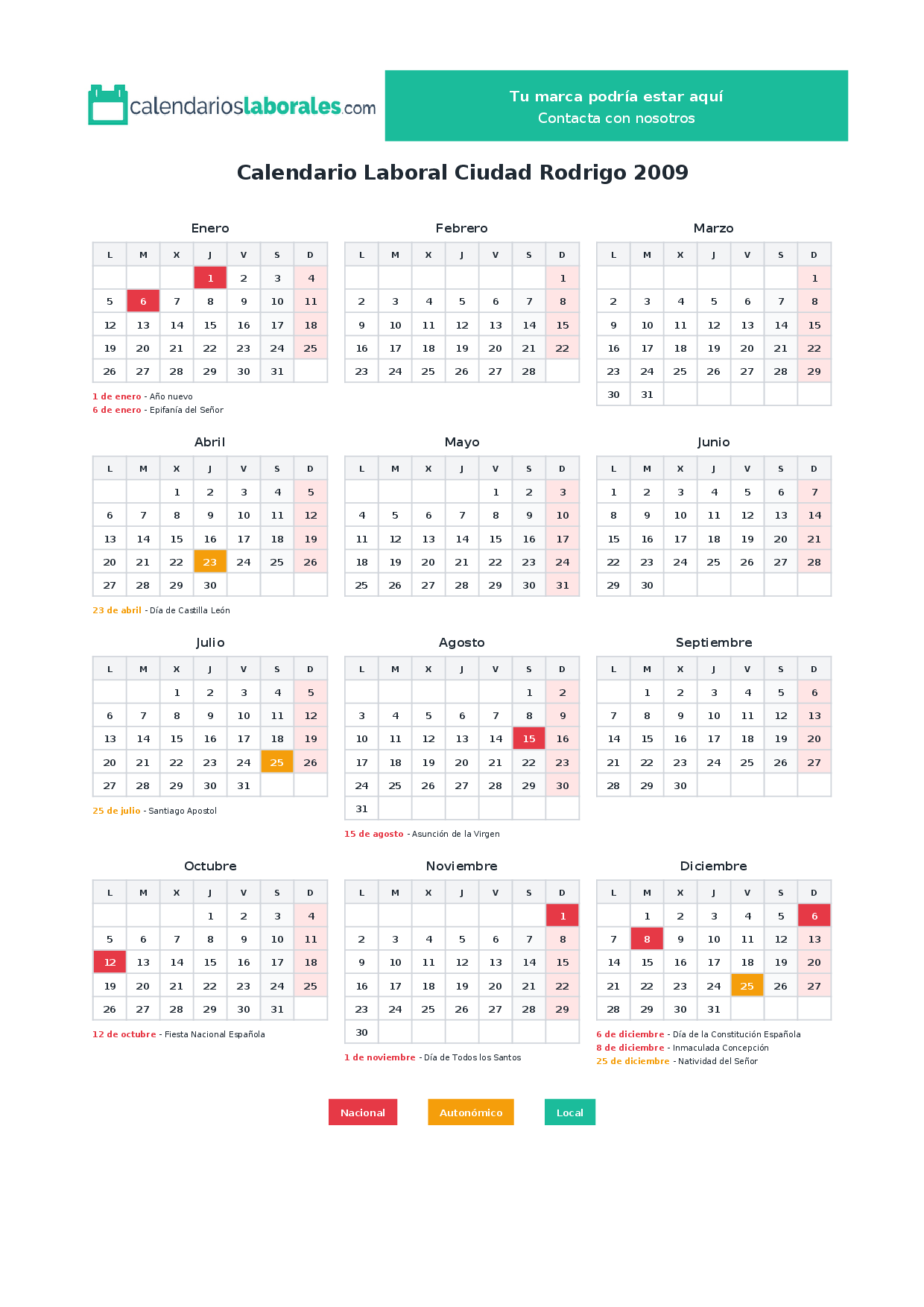 En 2009, 7 festivos nacionales se celebran en todo el territorio español, incluidos en el calendario laboral de Ciudad Rodrigo.
