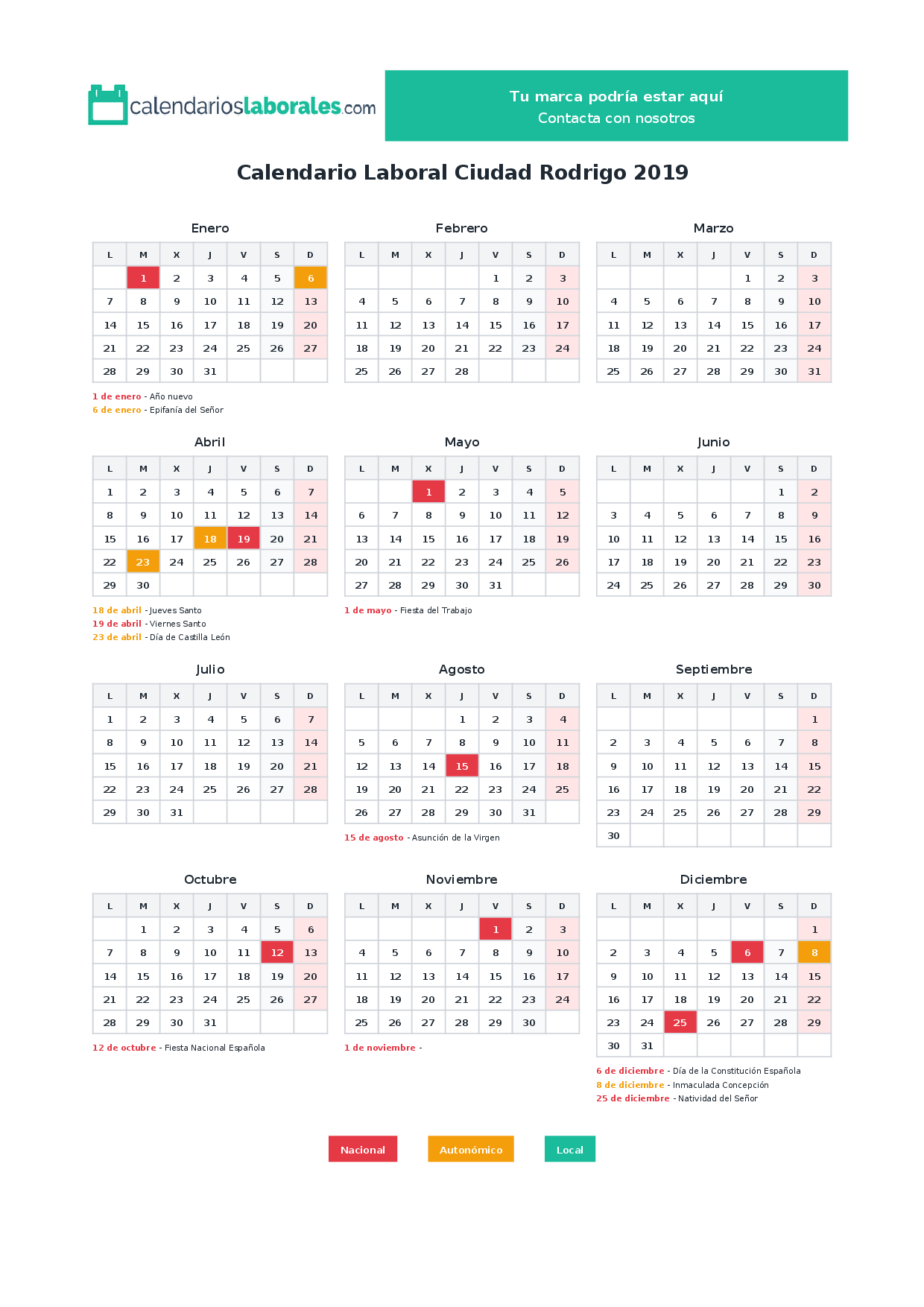 Calendario laboral Ciudad Rodrigo 2019