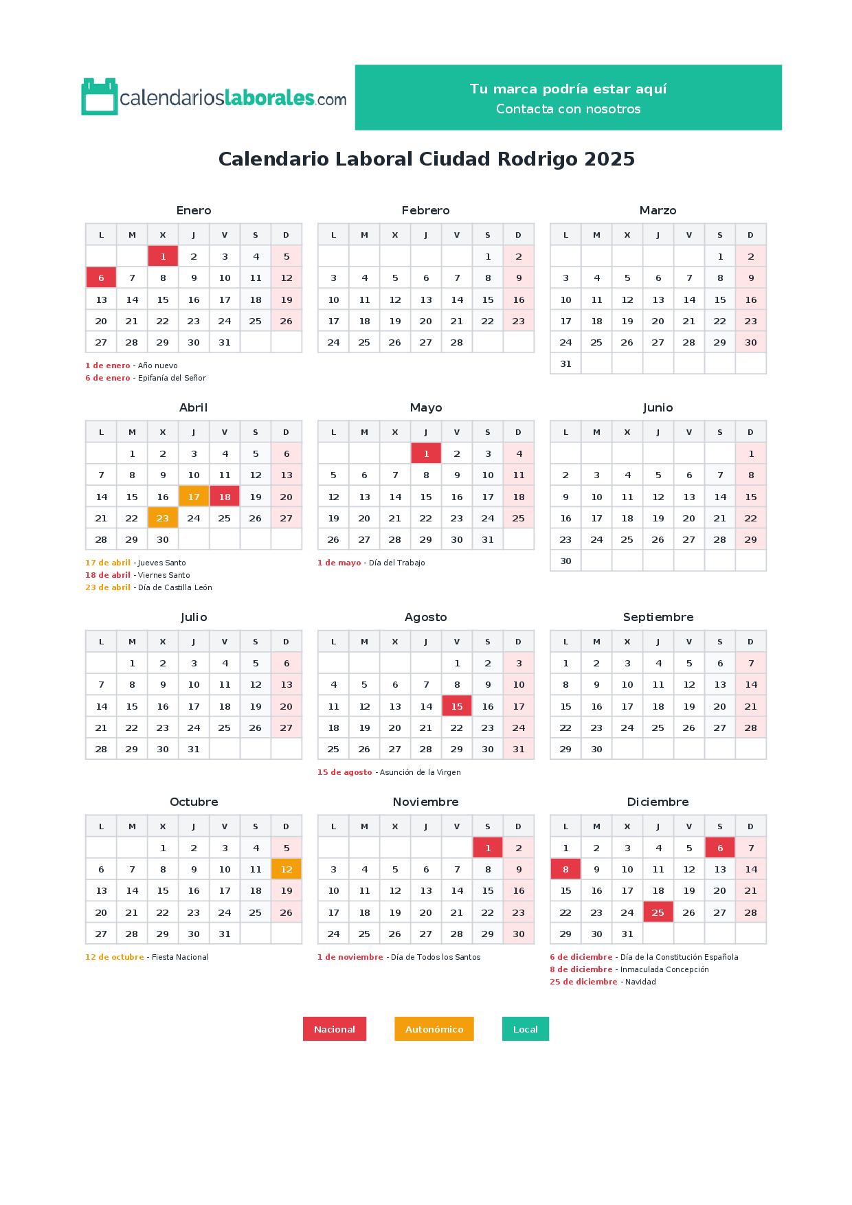 El calendario laboral de Ciudad Rodrigo en 2025 incluye un total de 12 días festivos, que combinan festivos nacionales, festivos autonómicos de Castilla León y los festivos locales propios del municipio.