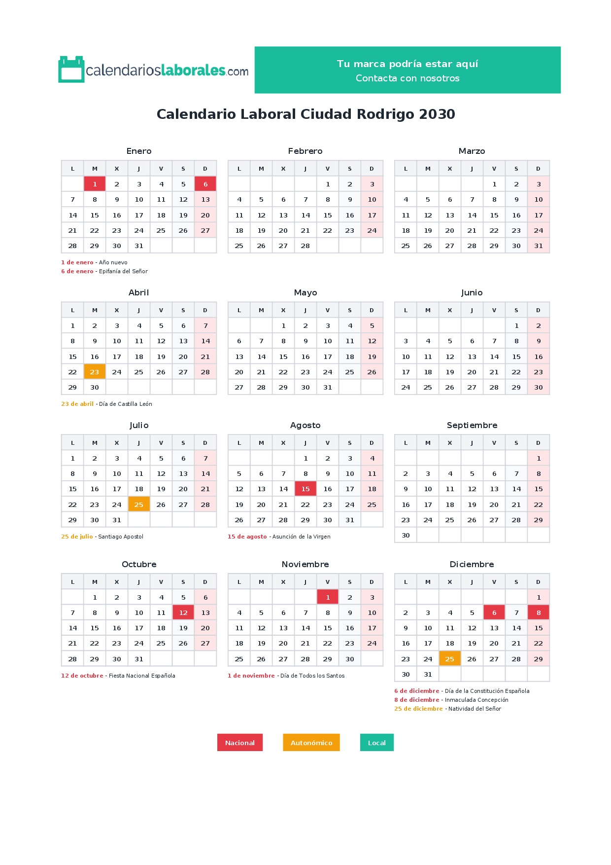 El calendario laboral de Ciudad Rodrigo en 2030 incluye un total de 10 días festivos, que combinan festivos nacionales, festivos autonómicos de Castilla León y los festivos locales propios del municipio.