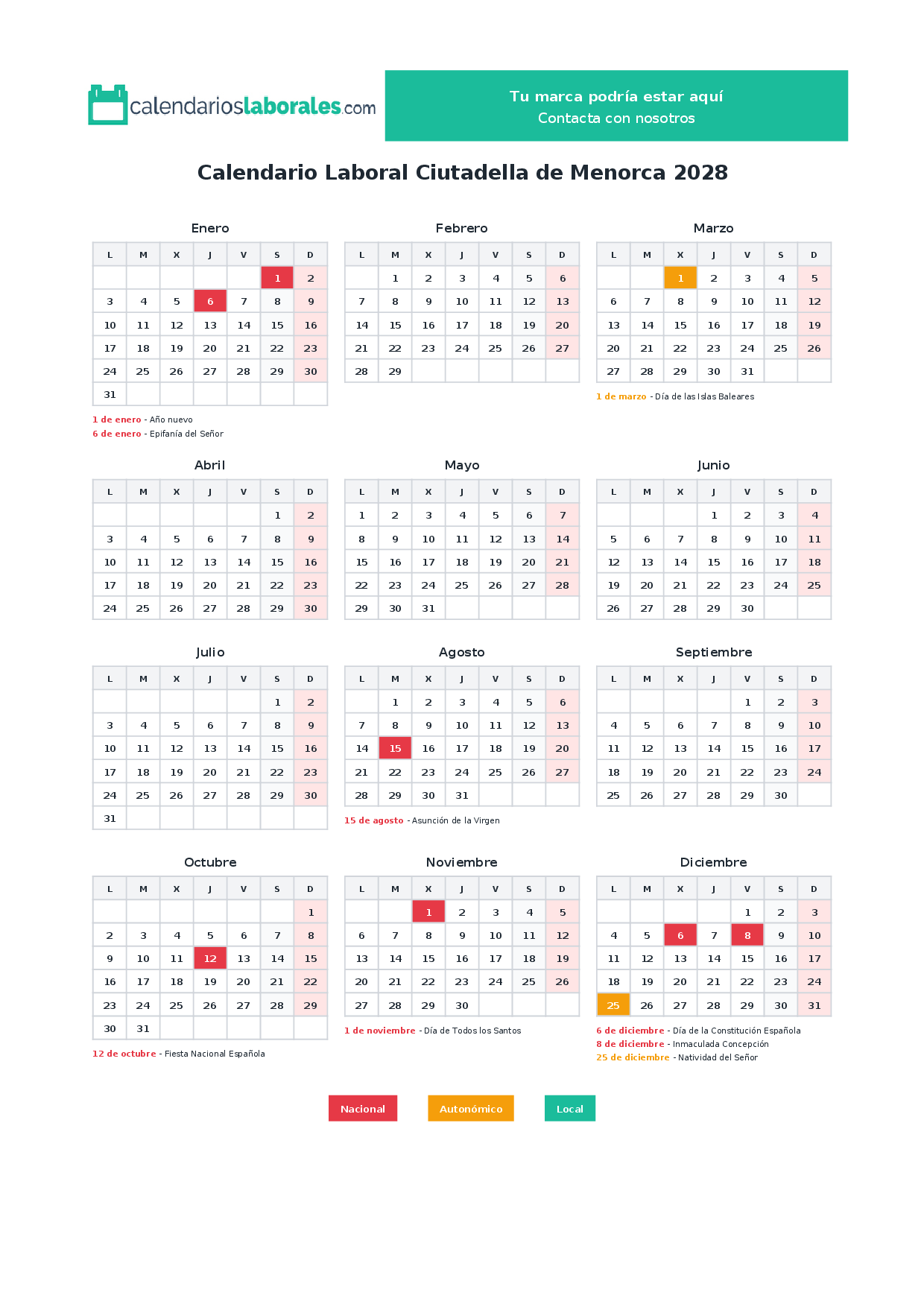 En 2028, 7 festivos nacionales se celebran en todo el territorio español, incluidos en el calendario laboral de Ciutadella de Menorca.
