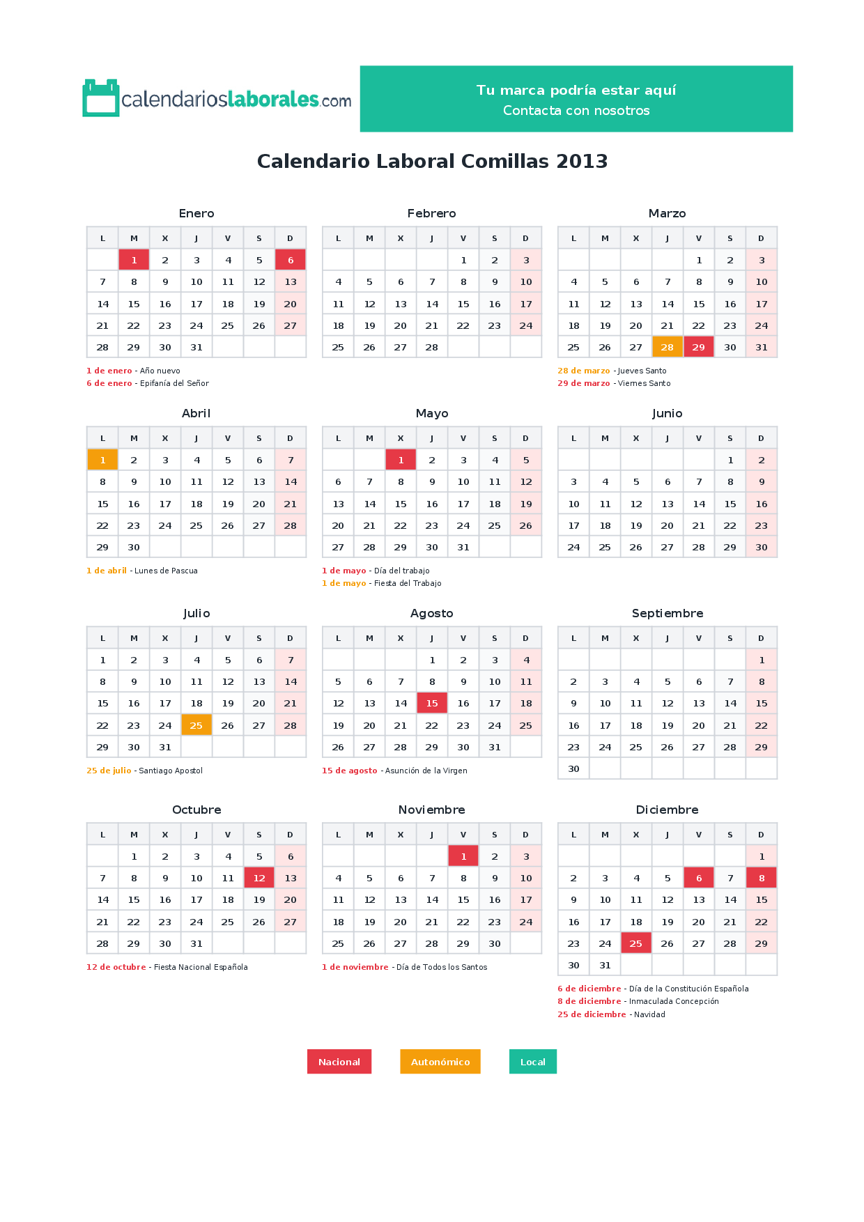 En 2013, 10 festivos nacionales se celebran en todo el territorio español, incluidos en el calendario laboral de Comillas.