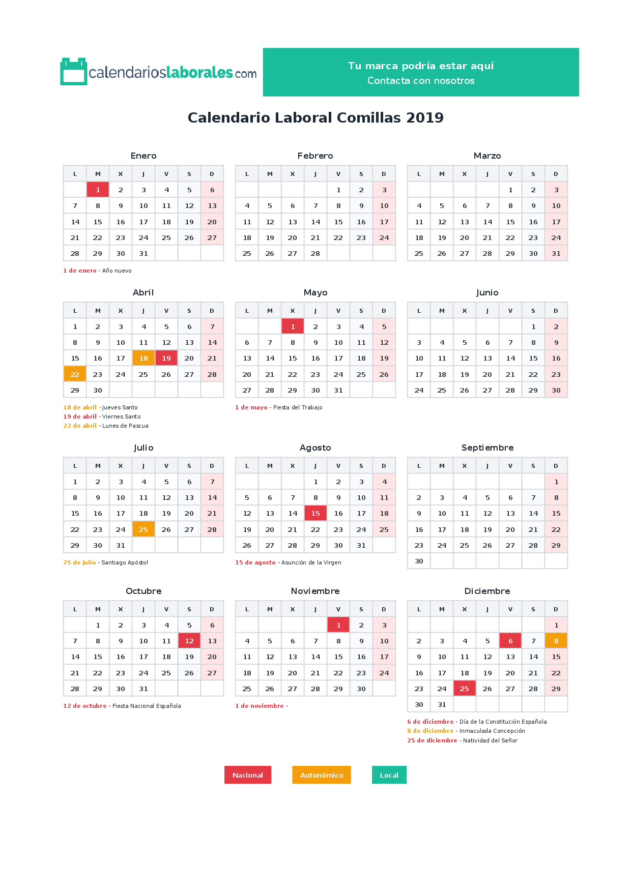 Calendario laboral Comillas 2019