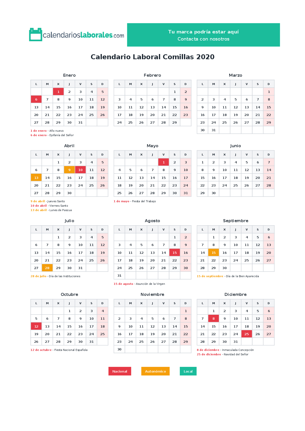 En 2020, 8 festivos nacionales se celebran en todo el territorio español, incluidos en el calendario laboral de Comillas.