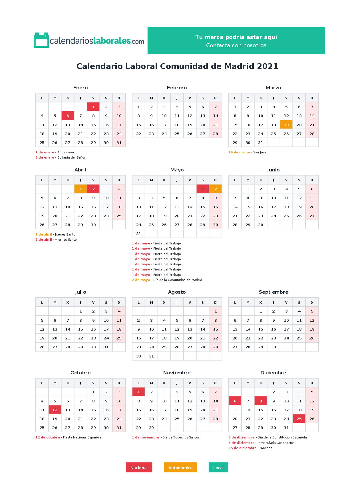 El calendario laboral de Comunidad de Madrid en 2021 incluye un total de 12 días festivos, que combinan festivos nacionales y festivos autonómicos establecidos por la comunidad autónoma.