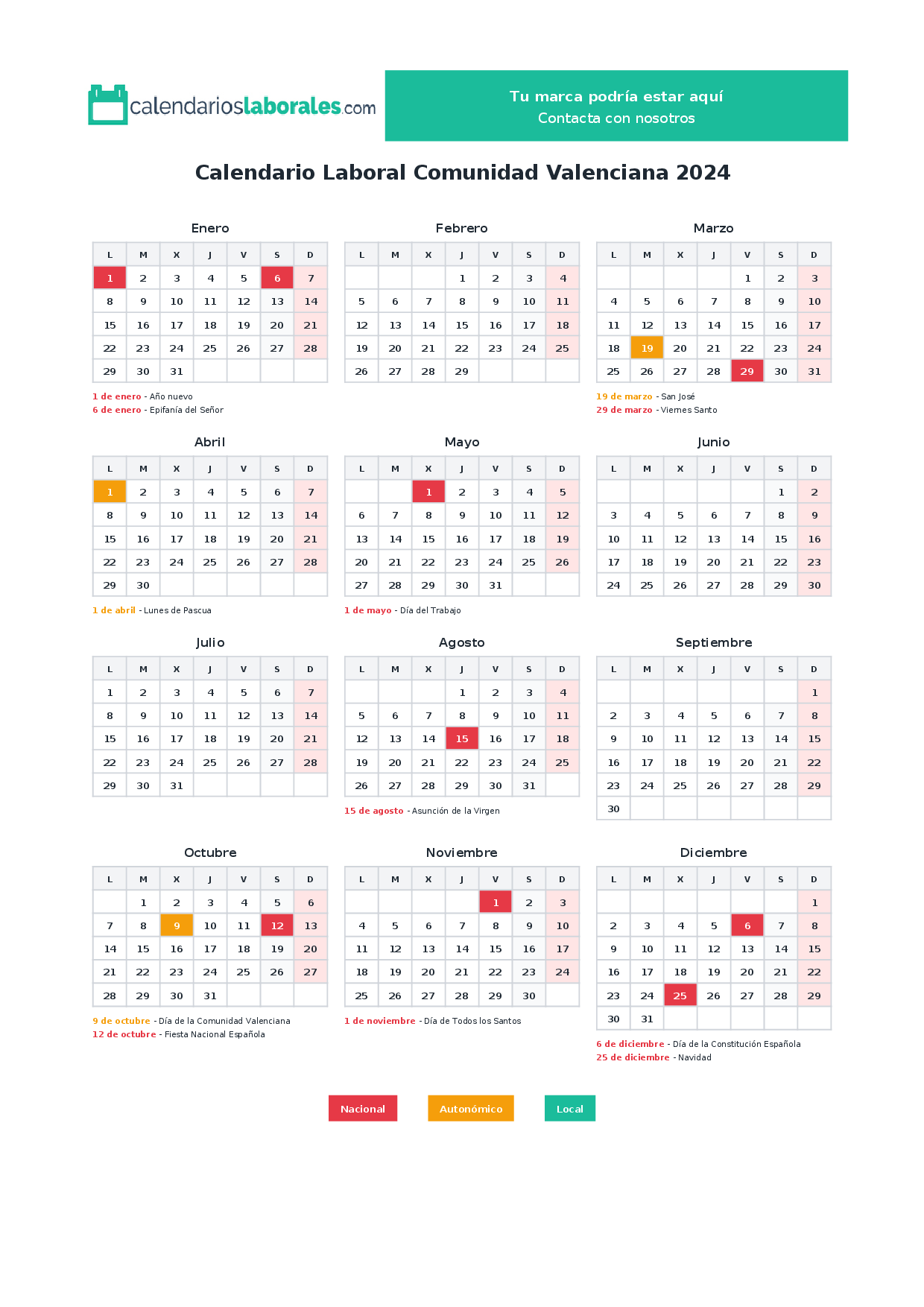 Calendario laboral Comunidad Valenciana 2024