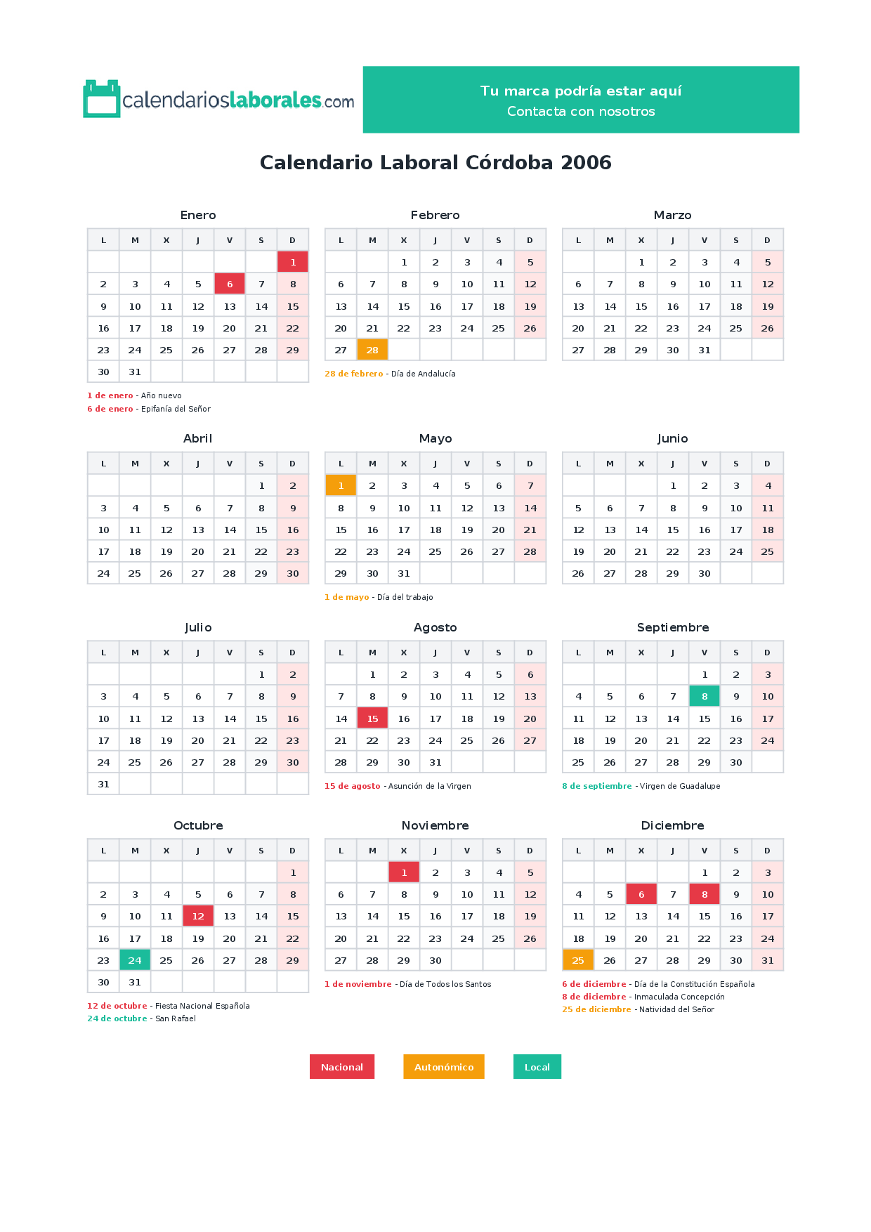 El calendario laboral de Córdoba en 2006 cuenta con un total de 12 días festivos, que incluyen festivos nacionales, festivos autonómicos de Andalucía y los festivos locales establecidos por cada municipio.