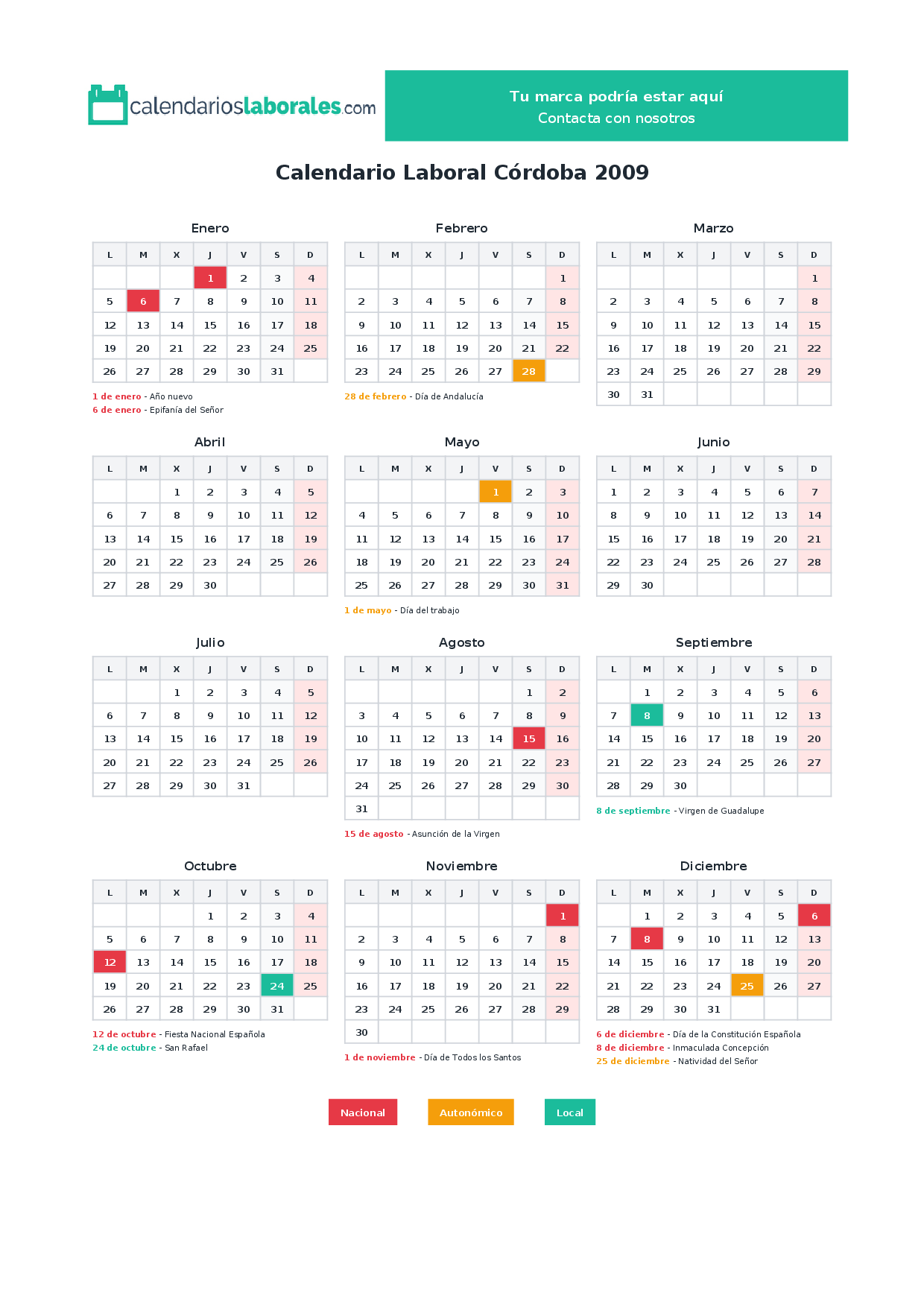 El calendario laboral de Córdoba en 2009 cuenta con un total de 12 días festivos, que incluyen festivos nacionales, festivos autonómicos de Andalucía y los festivos locales establecidos por cada municipio.