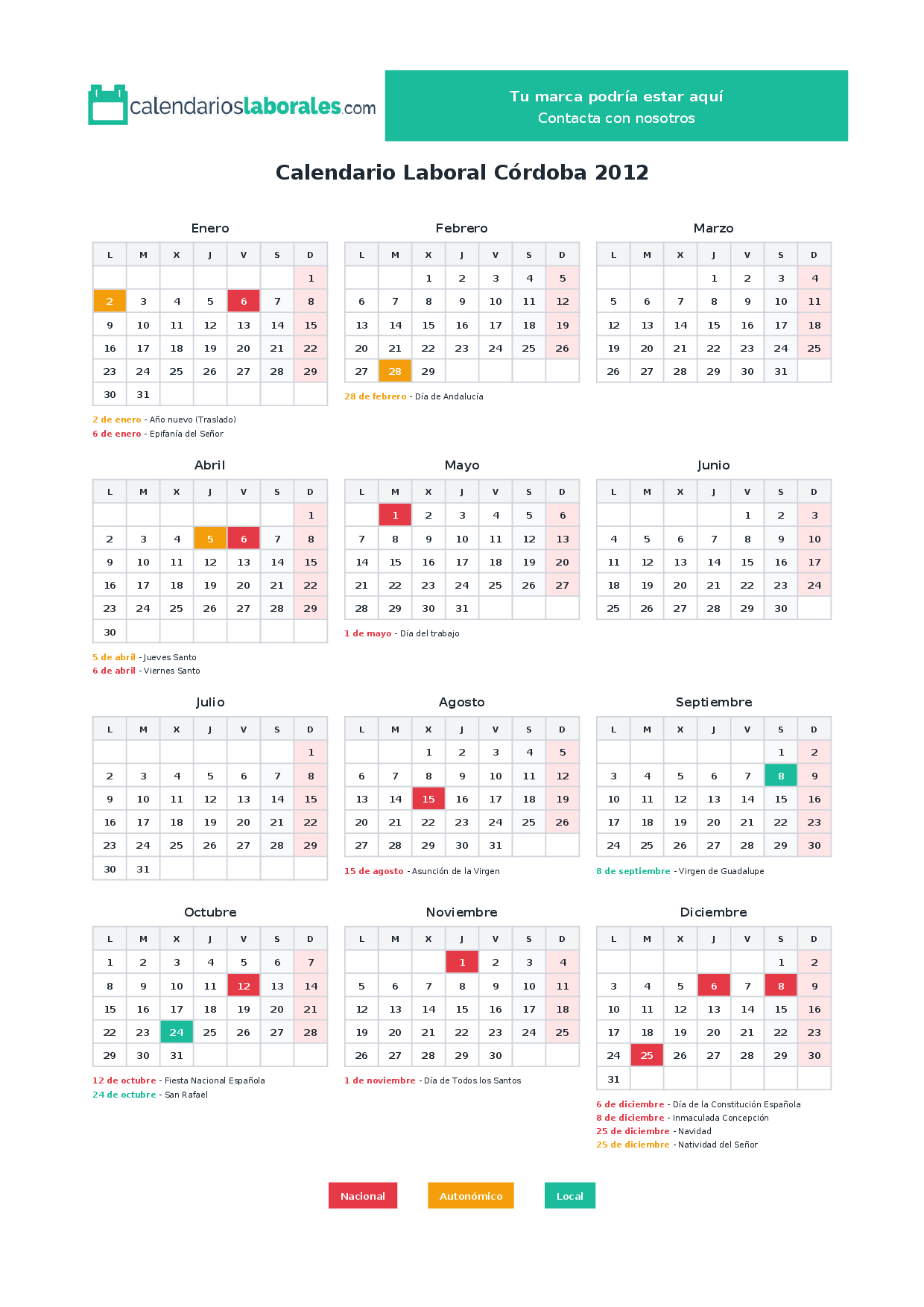 El calendario laboral de Córdoba en 2012 cuenta con un total de 14 días festivos, que incluyen festivos nacionales, festivos autonómicos de Andalucía y los festivos locales establecidos por cada municipio.