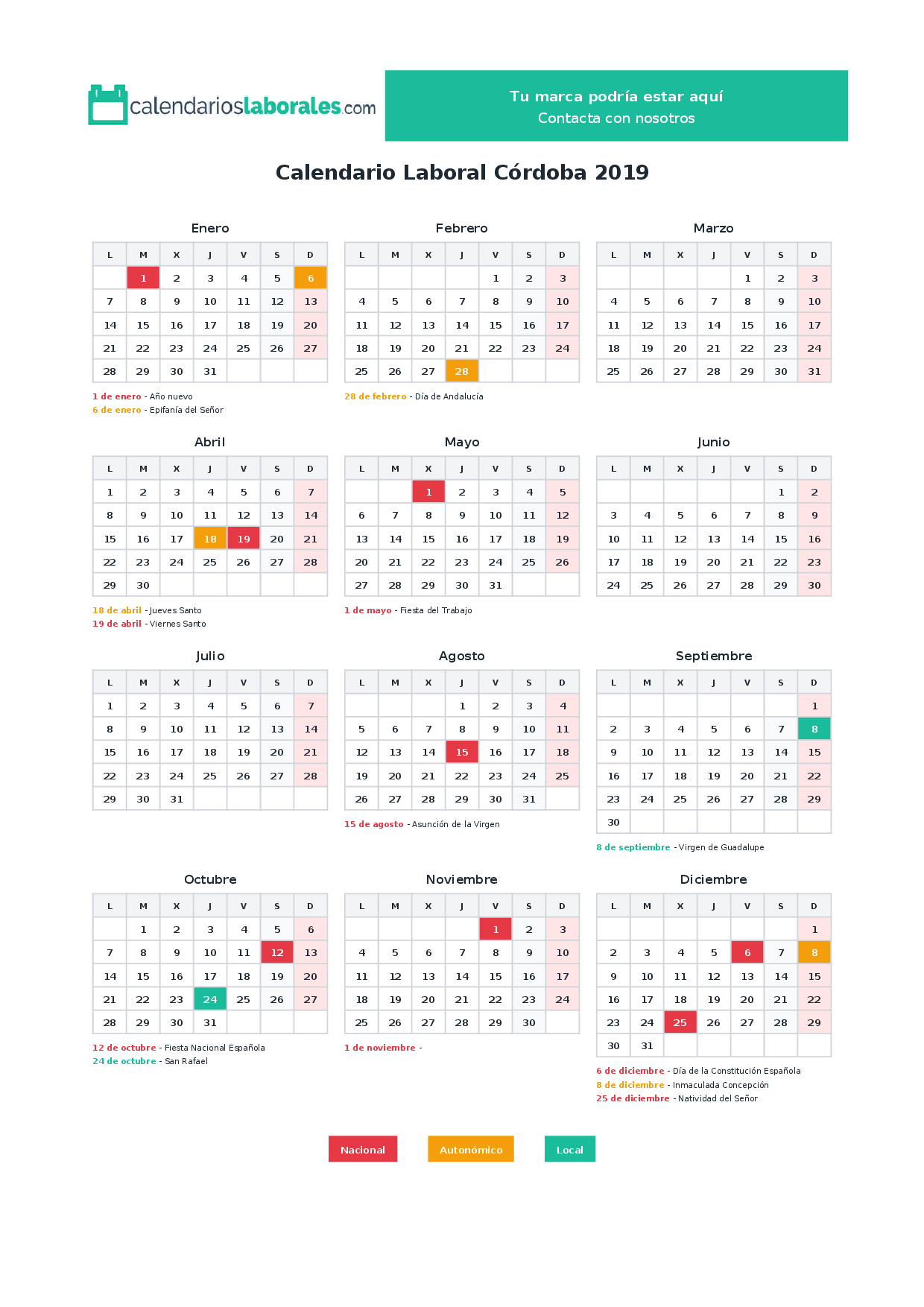 El calendario laboral de Córdoba en 2019 cuenta con un total de 14 días festivos, que incluyen festivos nacionales, festivos autonómicos de Andalucía y los festivos locales establecidos por cada municipio.