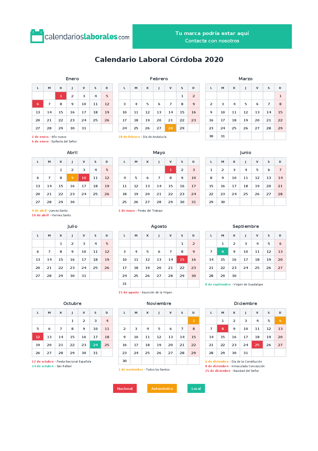 El calendario laboral de Córdoba en 2020 cuenta con un total de 14 días festivos, que incluyen festivos nacionales, festivos autonómicos de Andalucía y los festivos locales establecidos por cada municipio.