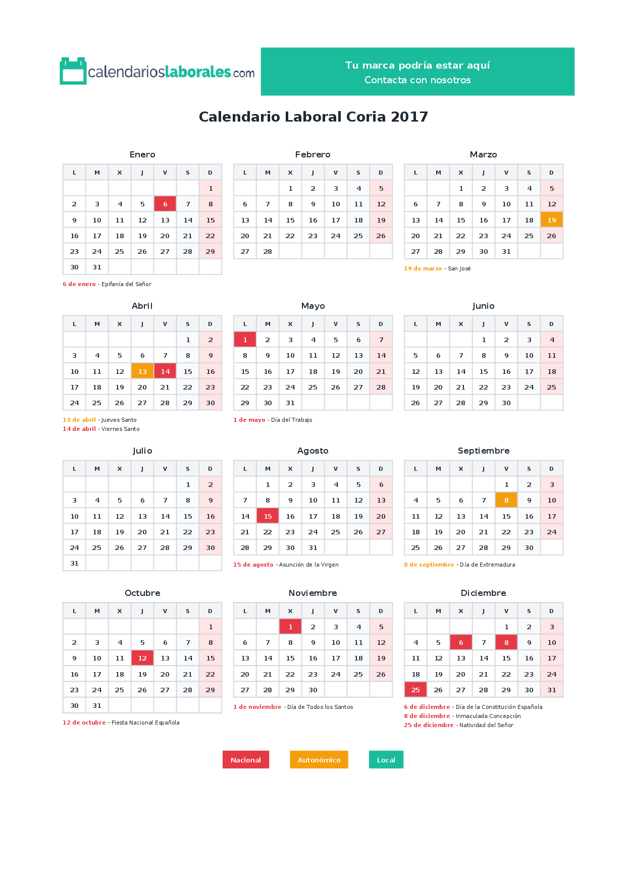 En 2017, 9 festivos nacionales se celebran en todo el territorio español, incluidos en el calendario laboral de Coria.