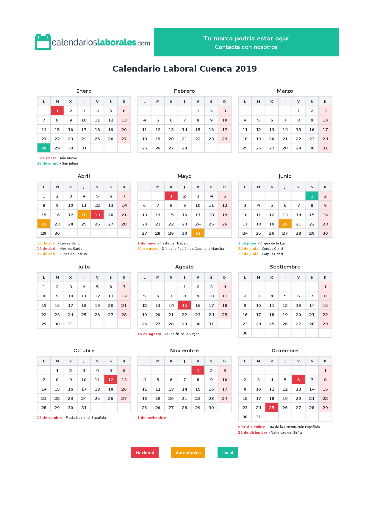 Calendario laboral Cuenca 2019