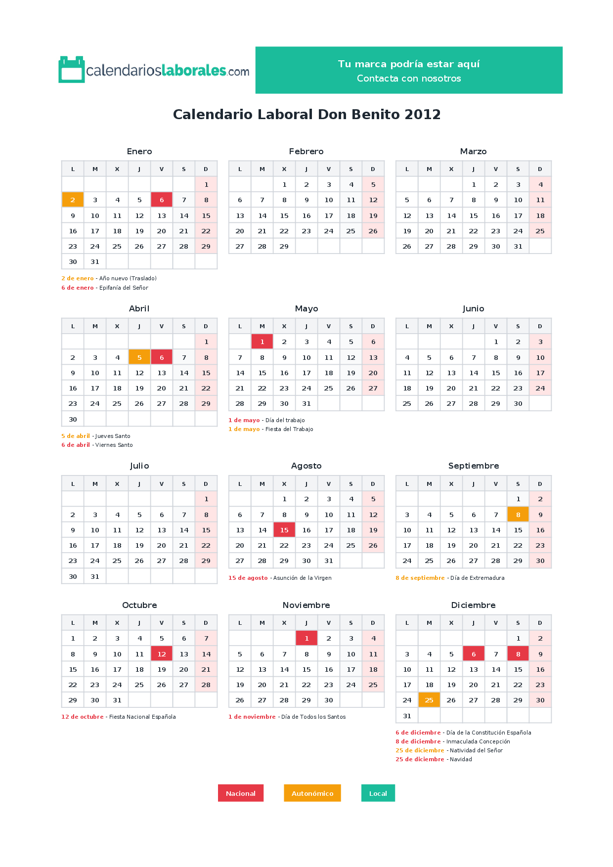 En 2012, 9 festivos nacionales se celebran en todo el territorio español, incluidos en el calendario laboral de Don Benito.