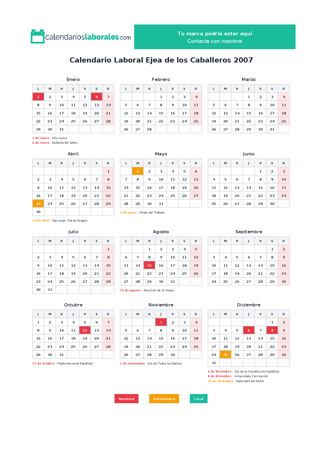 En 2007, 7 festivos nacionales se celebran en todo el territorio español, incluidos en el calendario laboral de Ejea de los Caballeros.