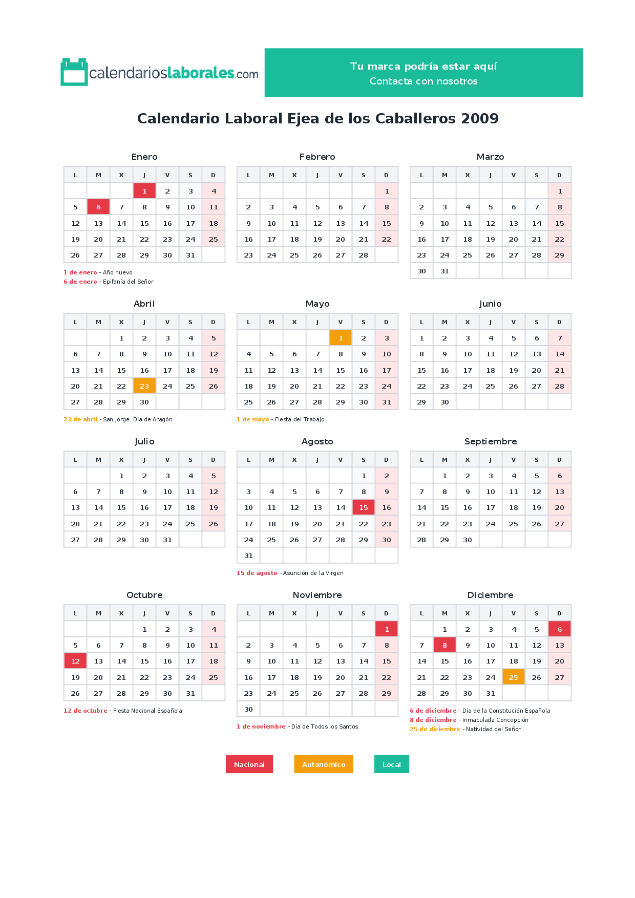 En 2009, 7 festivos nacionales se celebran en todo el territorio español, incluidos en el calendario laboral de Ejea de los Caballeros.