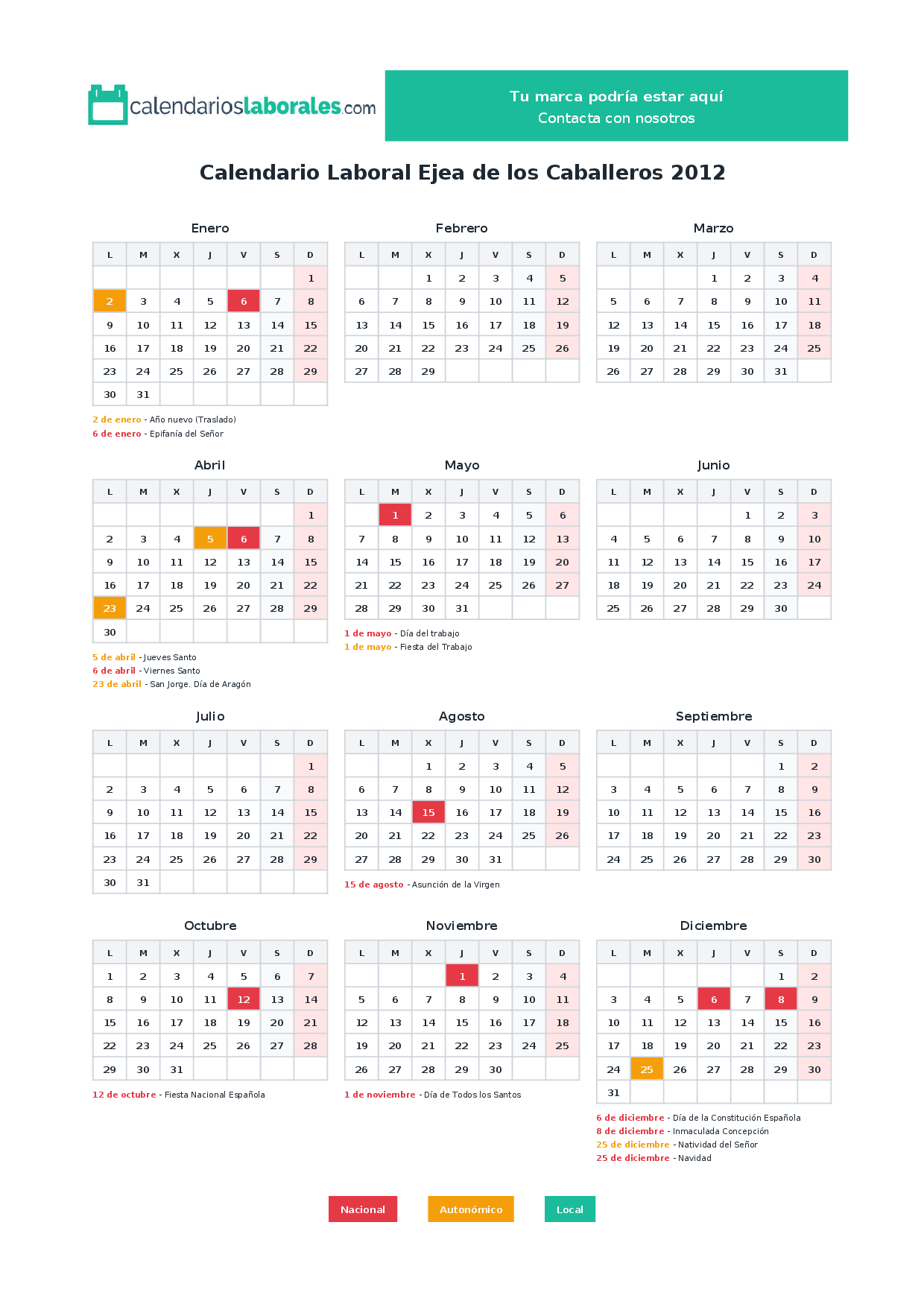 En 2012, 9 festivos nacionales se celebran en todo el territorio español, incluidos en el calendario laboral de Ejea de los Caballeros.