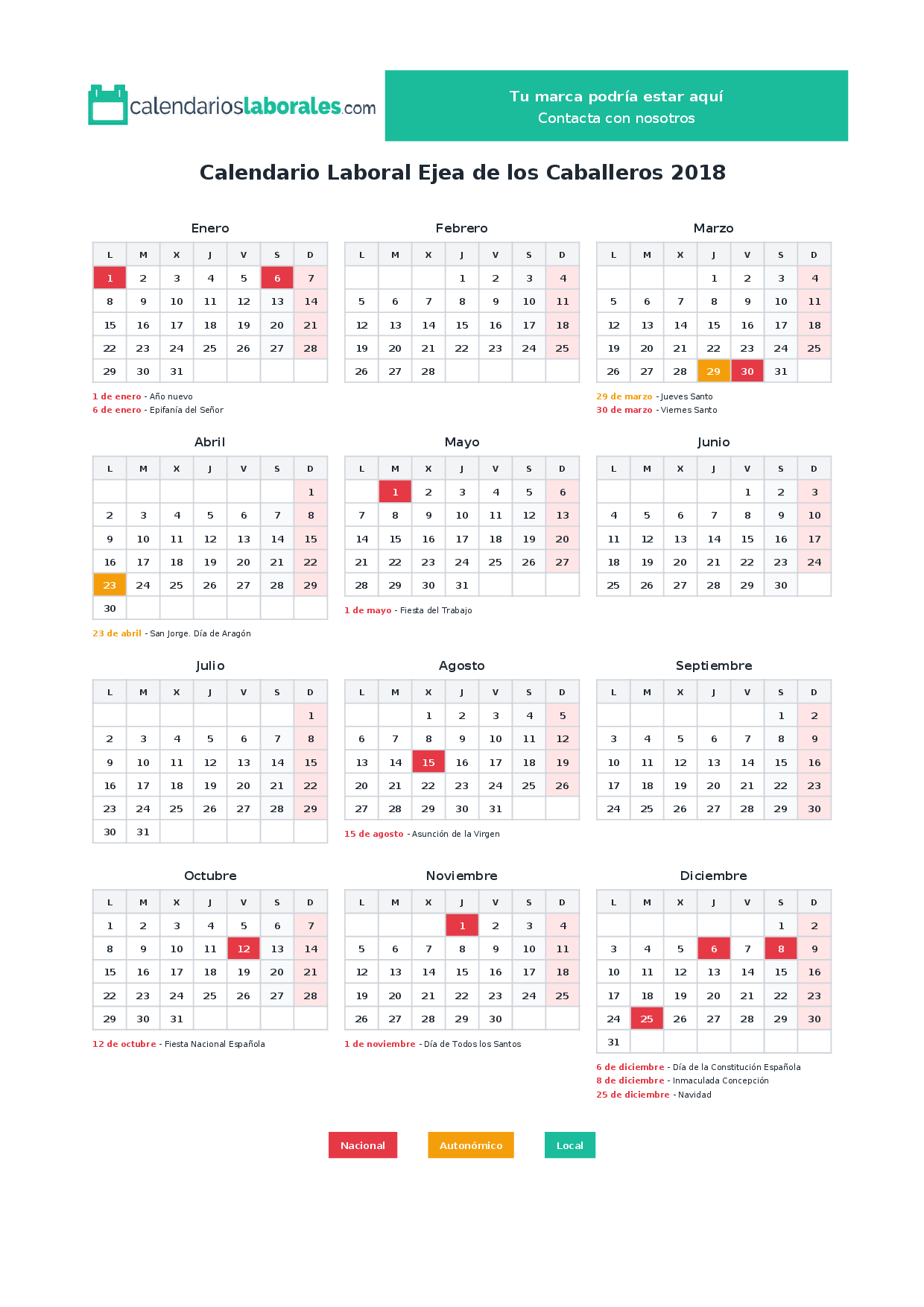 En 2018, 10 festivos nacionales se celebran en todo el territorio español, incluidos en el calendario laboral de Ejea de los Caballeros.