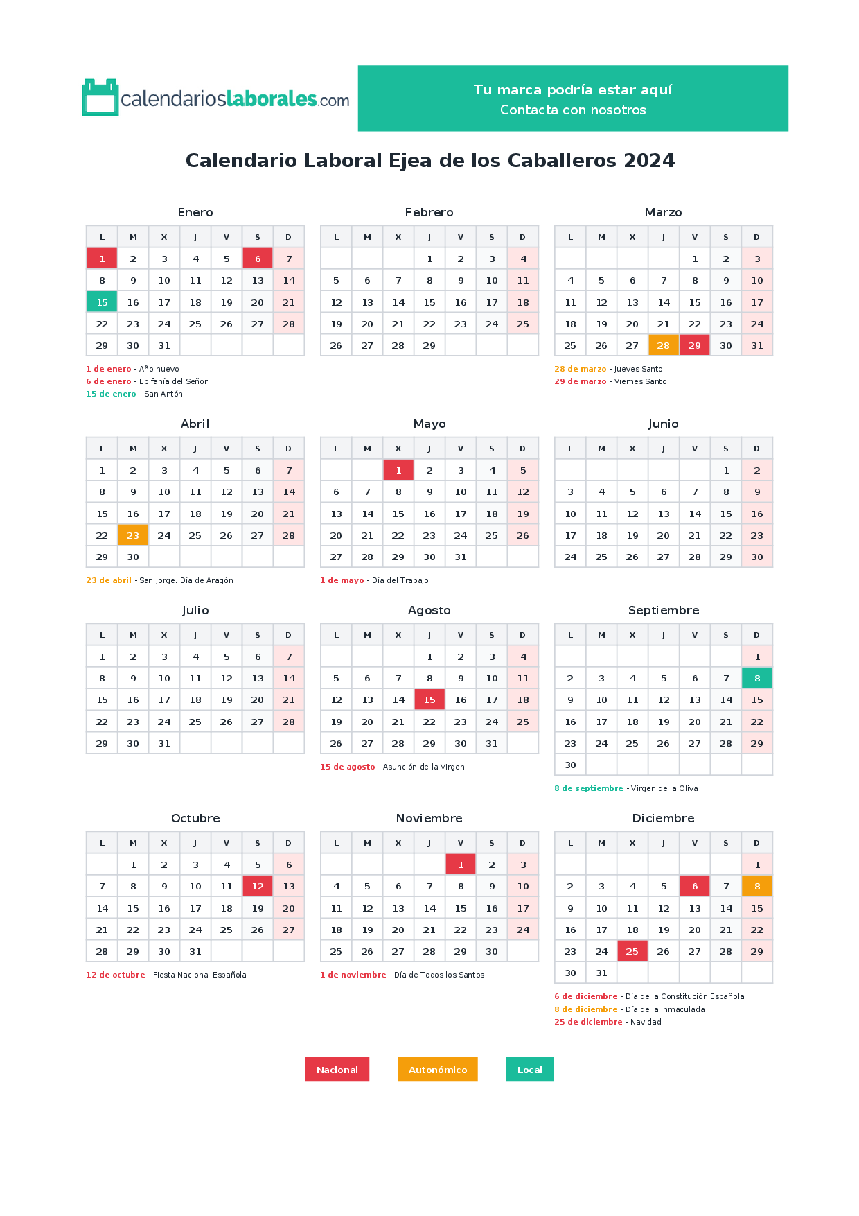 En 2024, 9 festivos nacionales se celebran en todo el territorio español, incluidos en el calendario laboral de Ejea de los Caballeros.