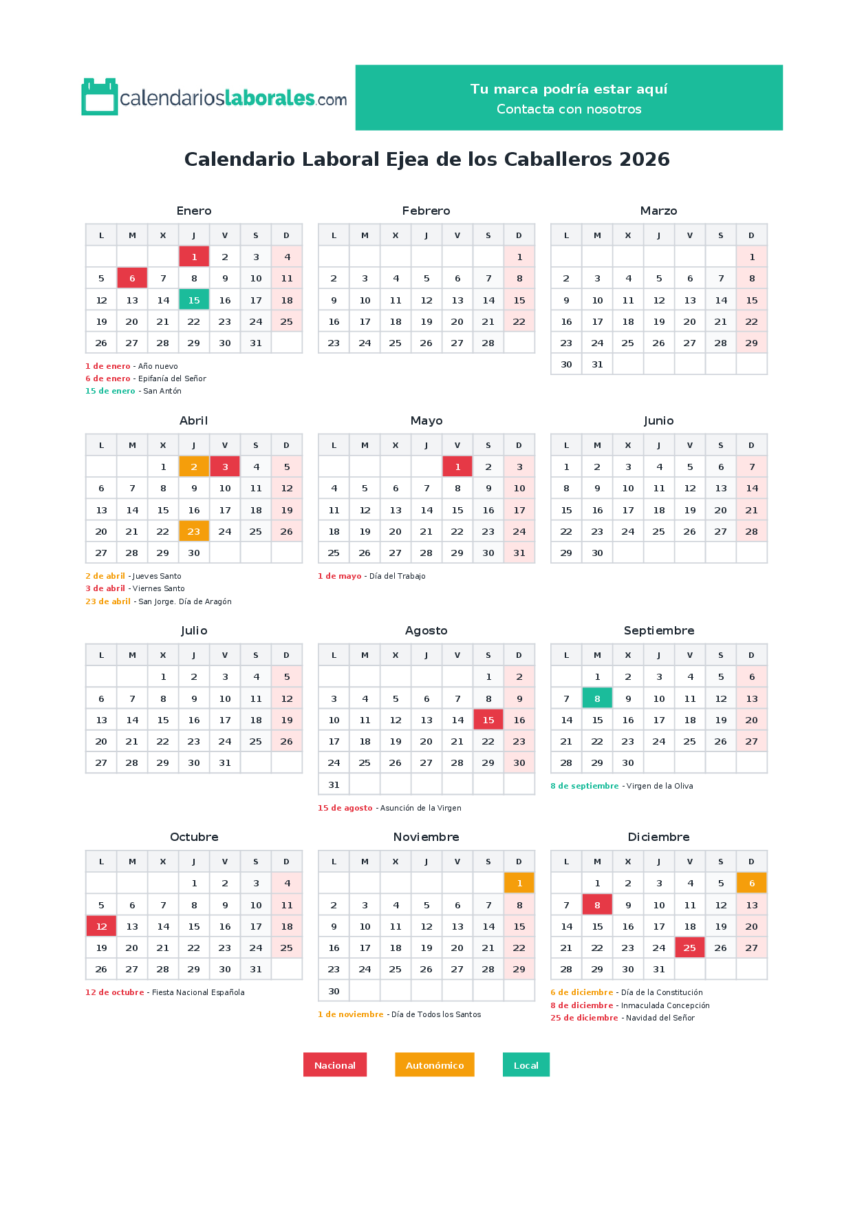 En 2026, 8 festivos nacionales se celebran en todo el territorio español, incluidos en el calendario laboral de Ejea de los Caballeros.