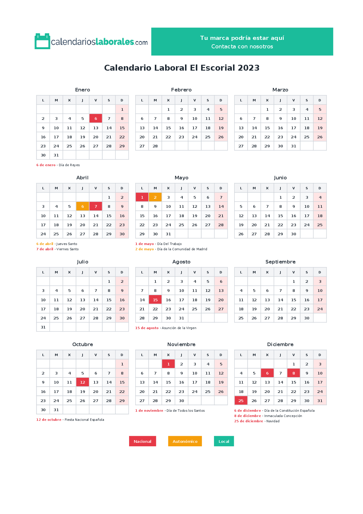 Además, el Ayuntamiento de El Escorial fija 0 festivos locales que completan el calendario laboral del municipio.