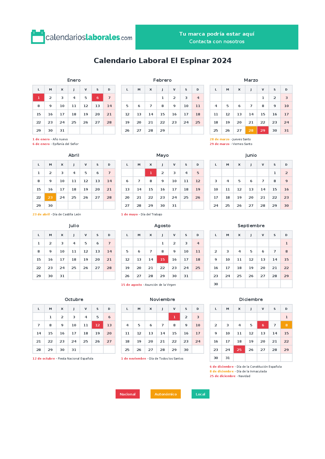 En 2024, 9 festivos nacionales se celebran en todo el territorio español, incluidos en el calendario laboral de El Espinar.