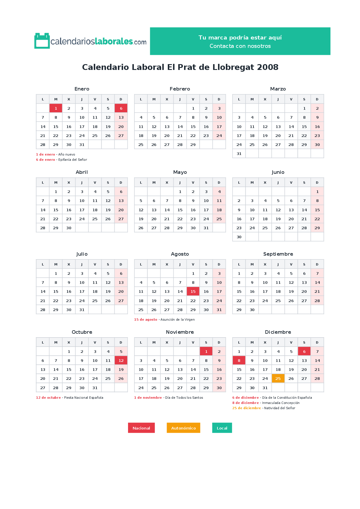 En 2008, 7 festivos nacionales se celebran en todo el territorio español, incluidos en el calendario laboral de El Prat de Llobregat.