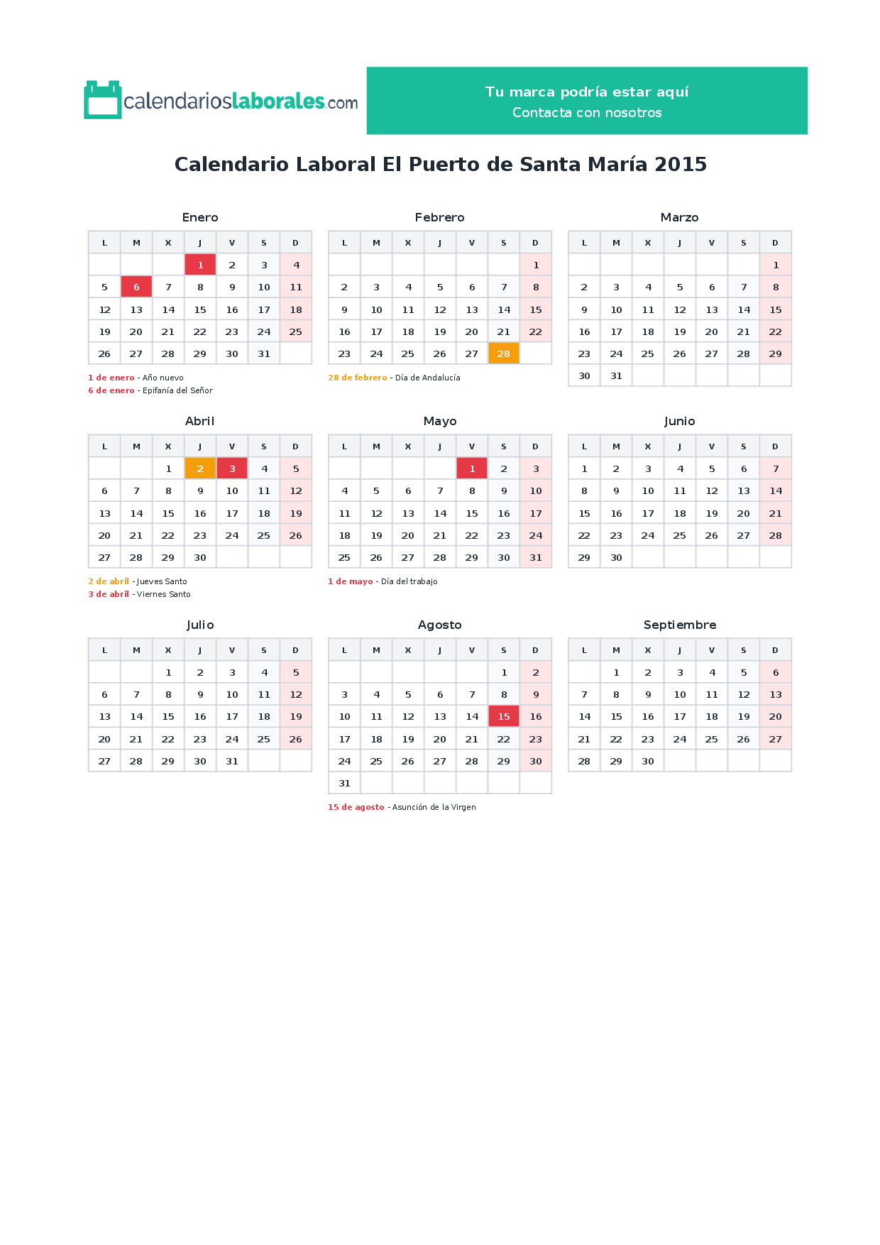 El calendario laboral de El Puerto de Santa María en 2015 incluye un total de 12 días festivos, que combinan festivos nacionales, festivos autonómicos de Andalucía y los festivos locales propios del municipio.