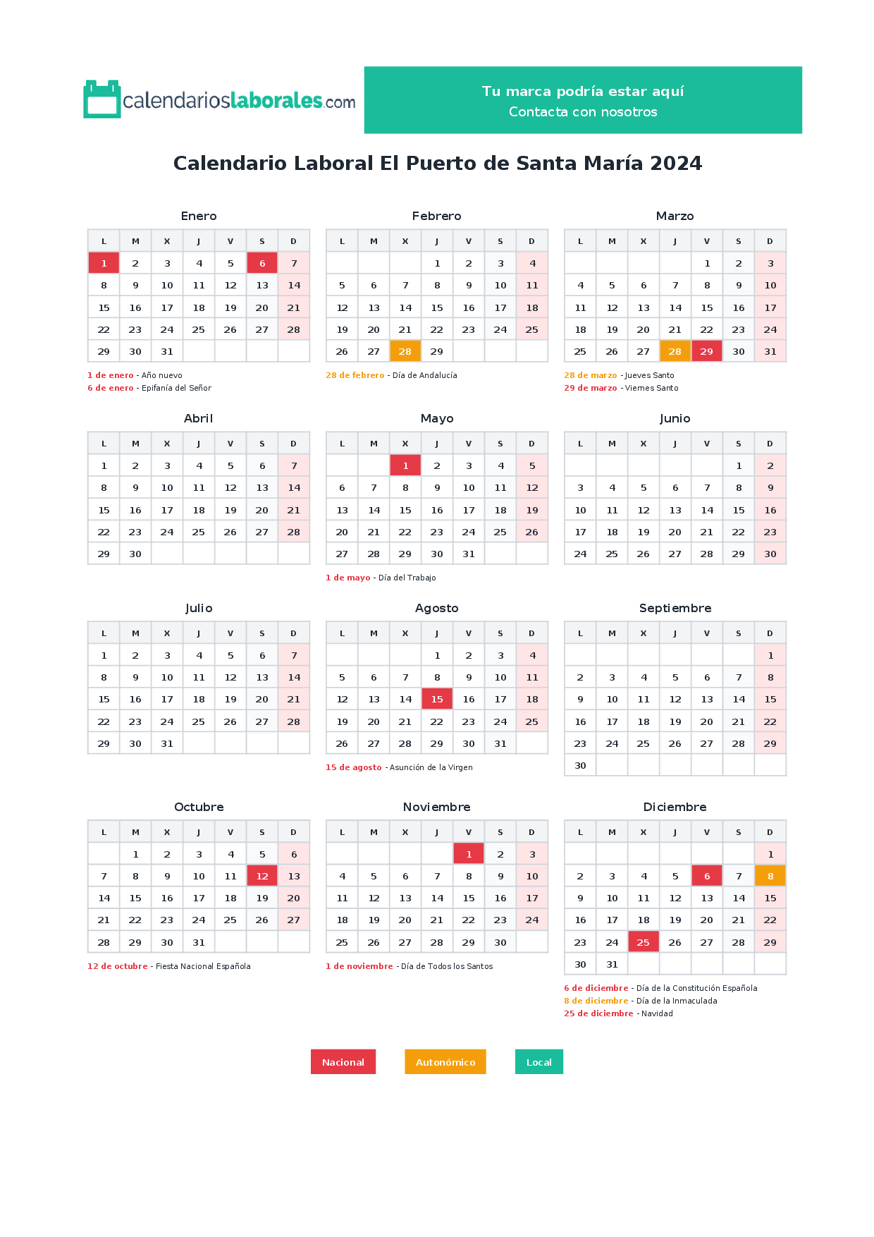 El calendario laboral de El Puerto de Santa María en 2024 incluye un total de 12 días festivos, que combinan festivos nacionales, festivos autonómicos de Andalucía y los festivos locales propios del municipio.