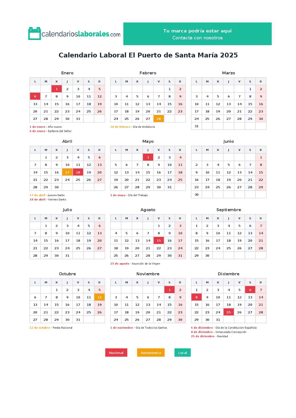 El calendario laboral de El Puerto de Santa María en 2025 incluye un total de 12 días festivos, que combinan festivos nacionales, festivos autonómicos de Andalucía y los festivos locales propios del municipio.