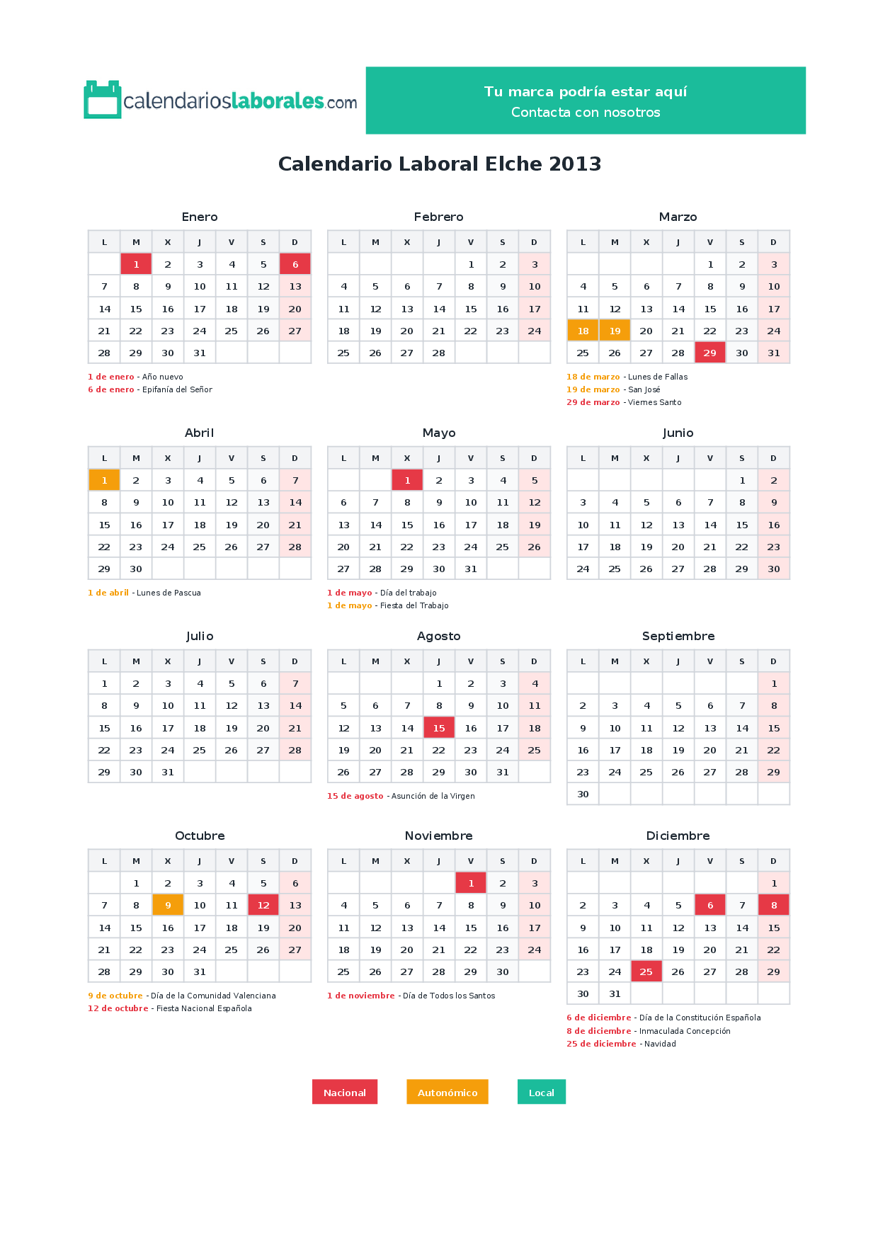En 2013, 10 festivos nacionales se celebran en todo el territorio español, incluidos en el calendario laboral de Elche.