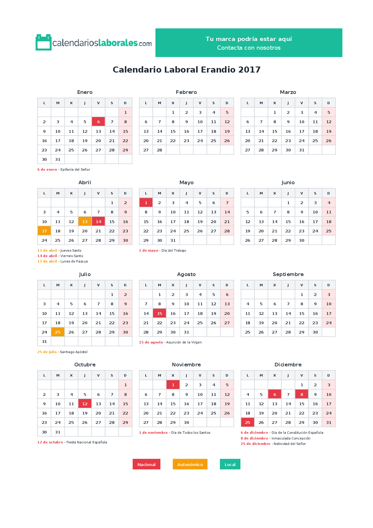 El calendario laboral de Erandio en 2017 incluye un total de 12 días festivos, que combinan festivos nacionales, festivos autonómicos de País Vasco y los festivos locales propios del municipio.