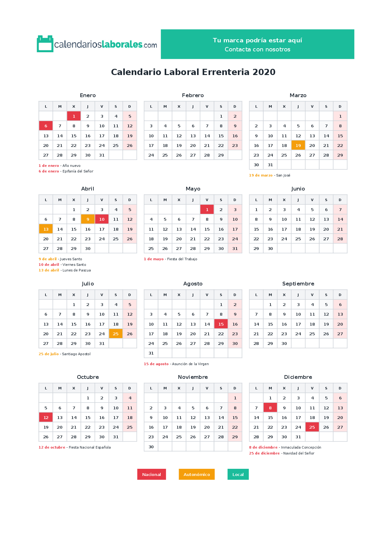 El calendario laboral de Errenteria en 2020 incluye un total de 12 días festivos, que combinan festivos nacionales, festivos autonómicos de País Vasco y los festivos locales propios del municipio.