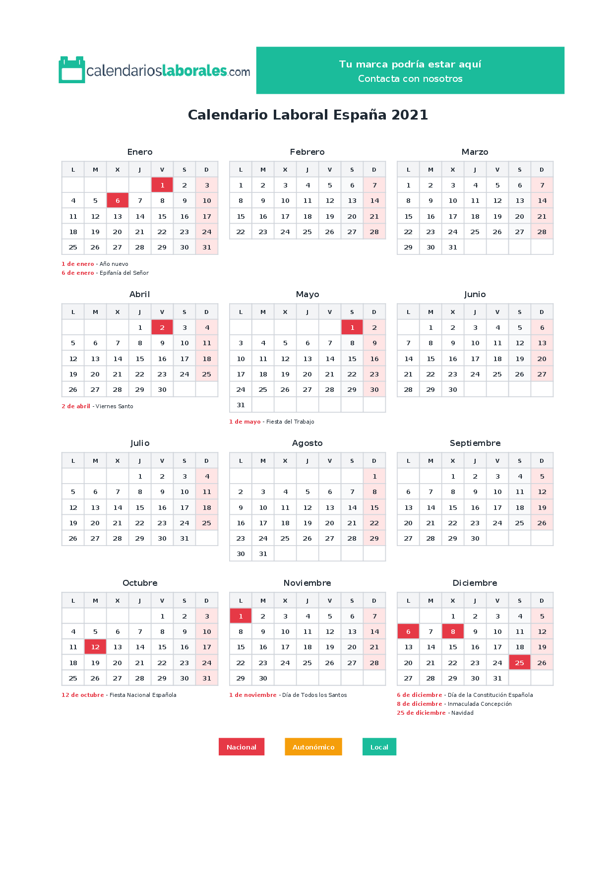 El calendario laboral de España 2021 incluye un total de 9 festivos nacionales oficiales, establecidos por el Gobierno y publicados en el Boletín Oficial del Estado (BOE).