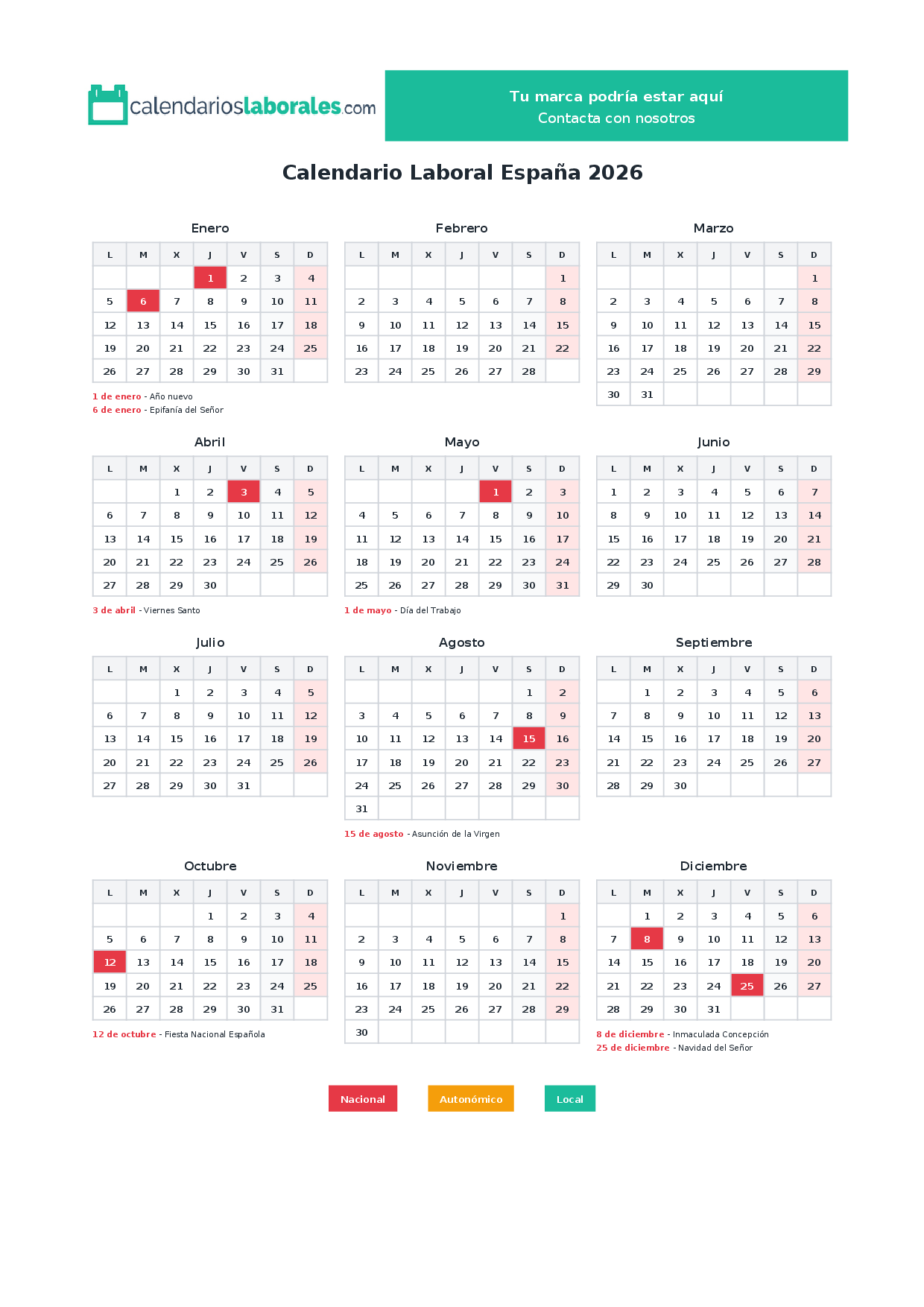 El calendario laboral de España 2026 incluye un total de 8 festivos nacionales oficiales, establecidos por el Gobierno y publicados en el Boletín Oficial del Estado (BOE).