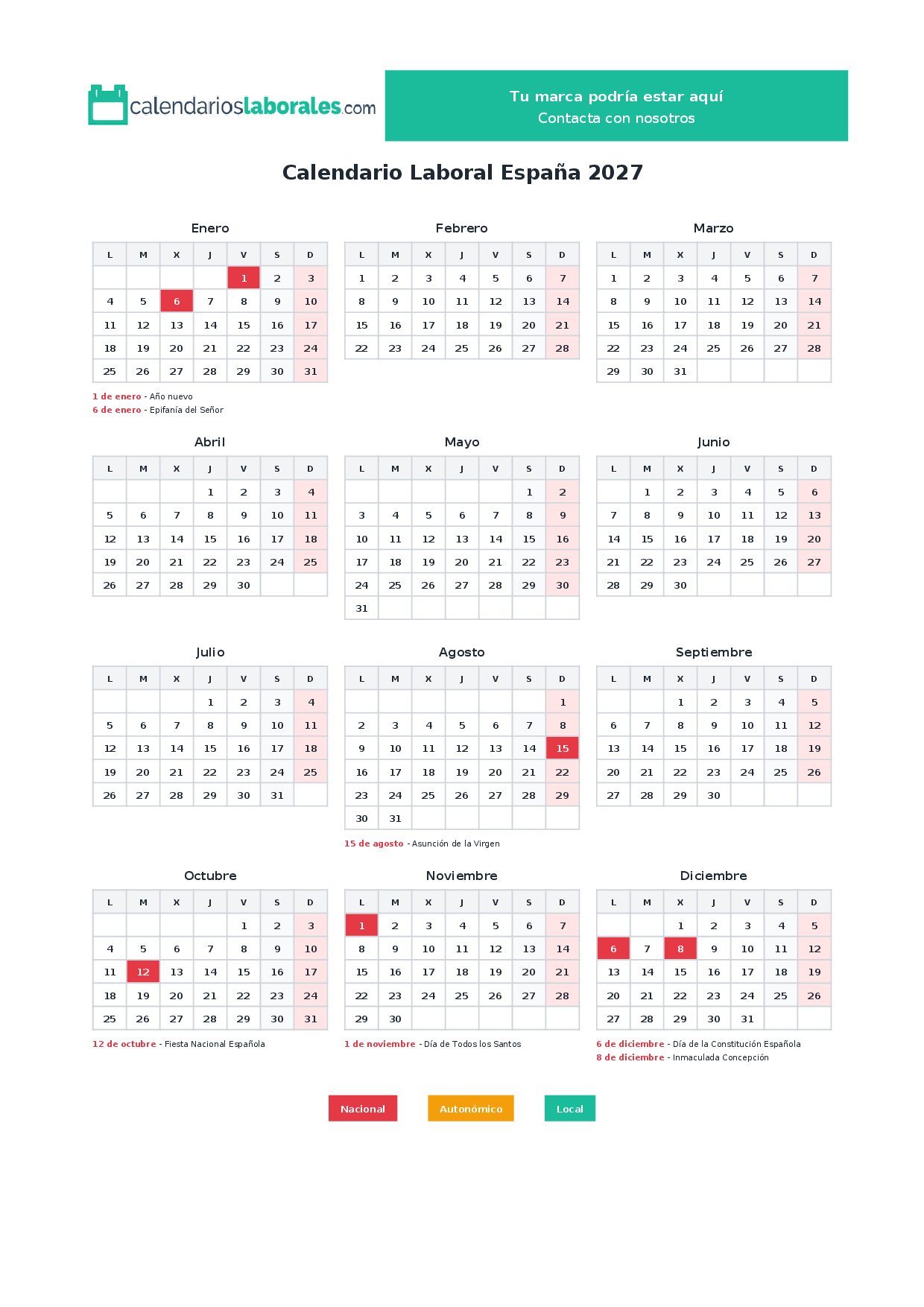 El calendario laboral de España 2027 incluye un total de 7 festivos nacionales oficiales, establecidos por el Gobierno y publicados en el Boletín Oficial del Estado (BOE).