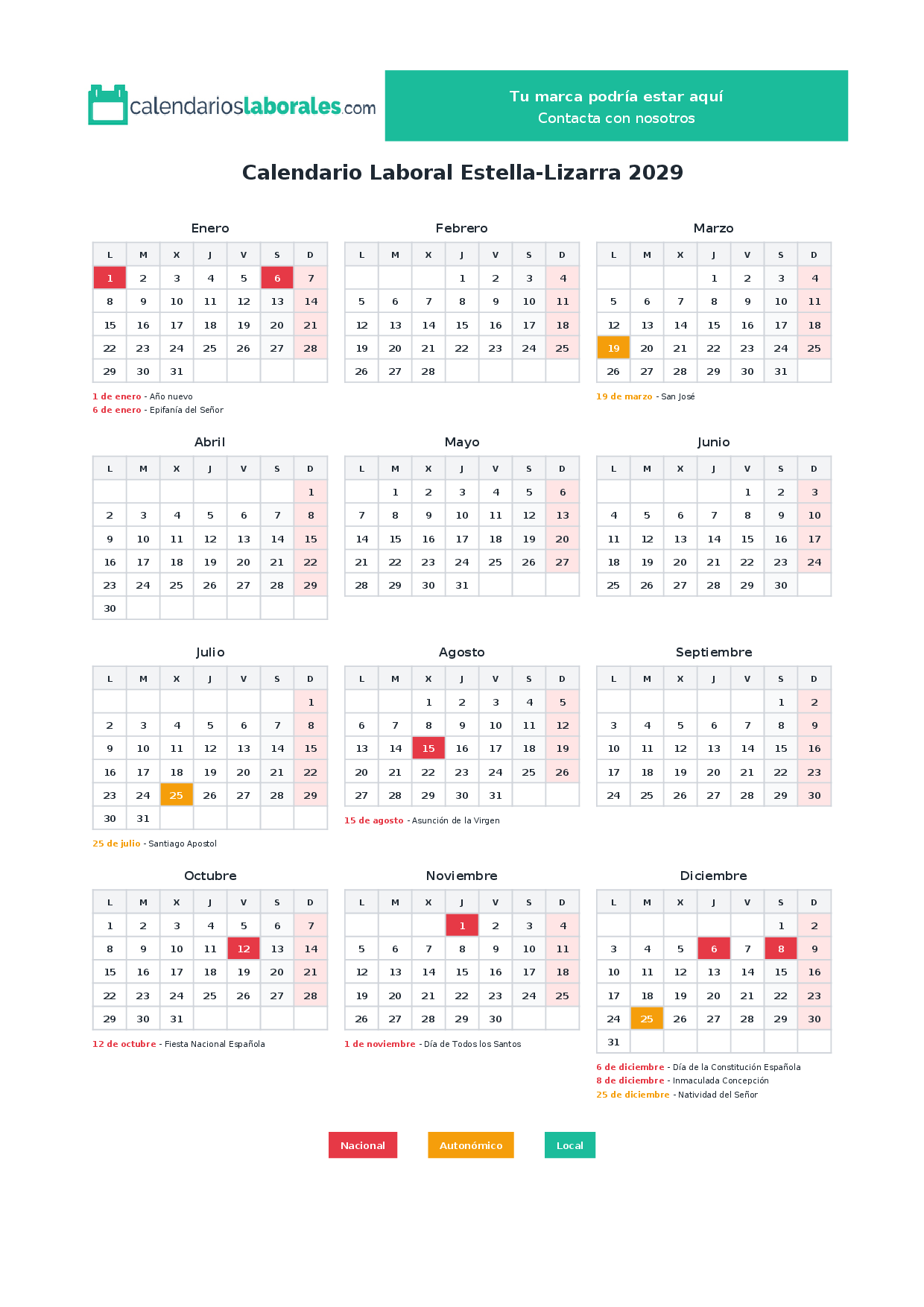 En 2029, 7 festivos nacionales se celebran en todo el territorio español, incluidos en el calendario laboral de Estella-Lizarra.