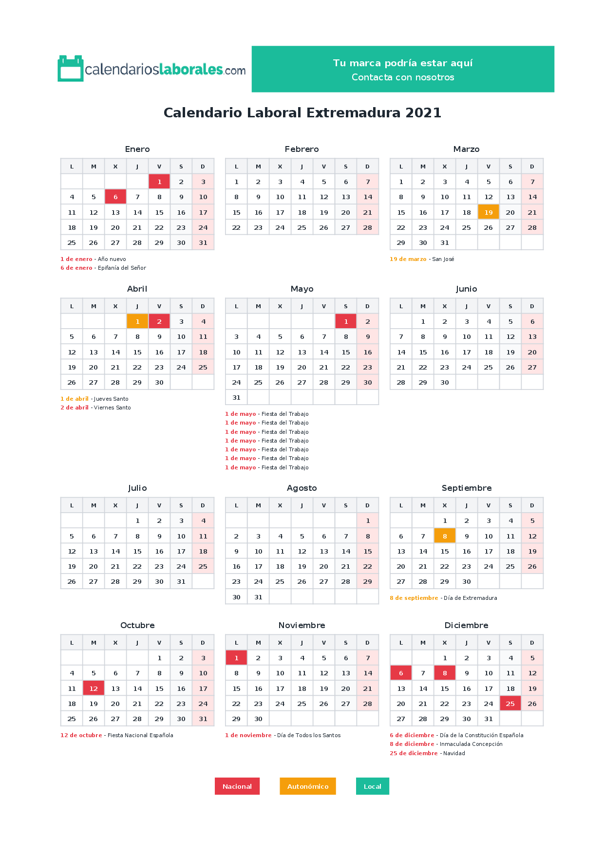 Calendario laboral Extremadura 2021