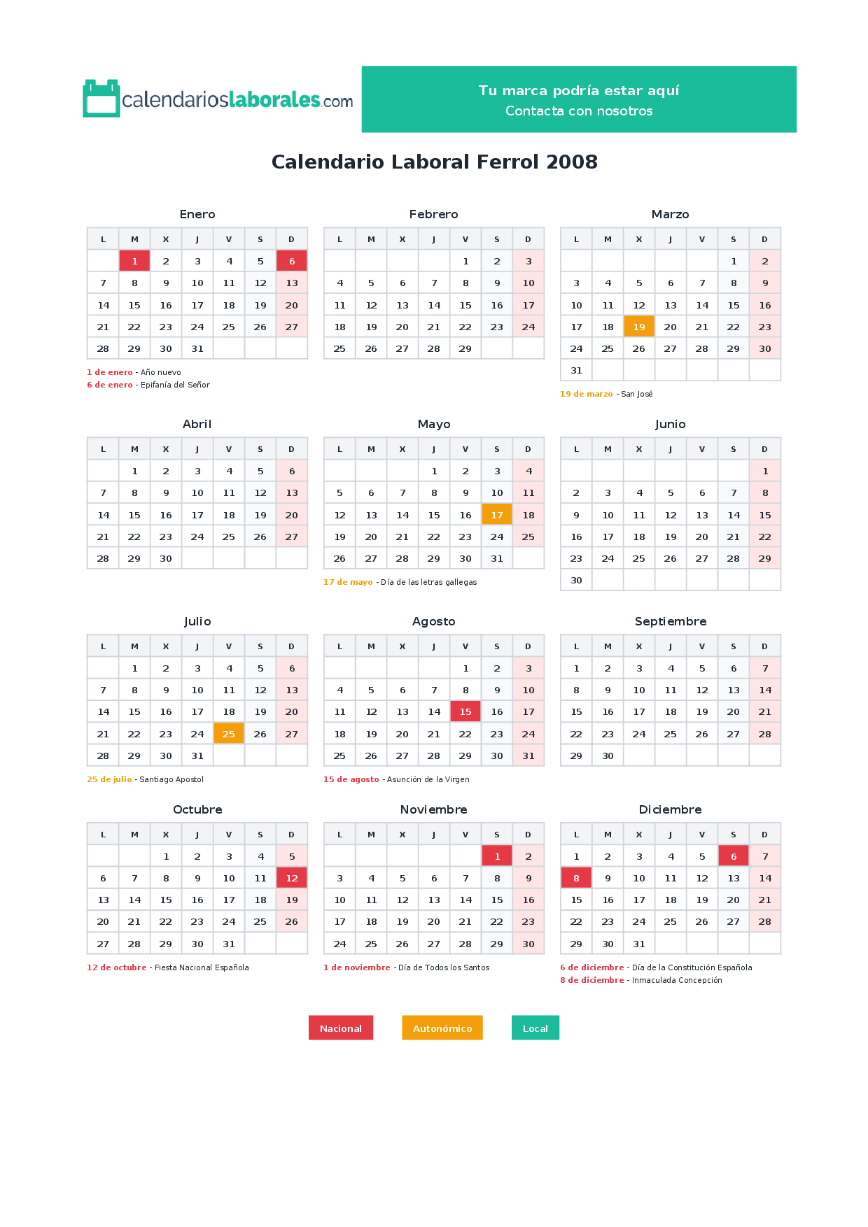 En 2008, 7 festivos nacionales se celebran en todo el territorio español, incluidos en el calendario laboral de Ferrol.