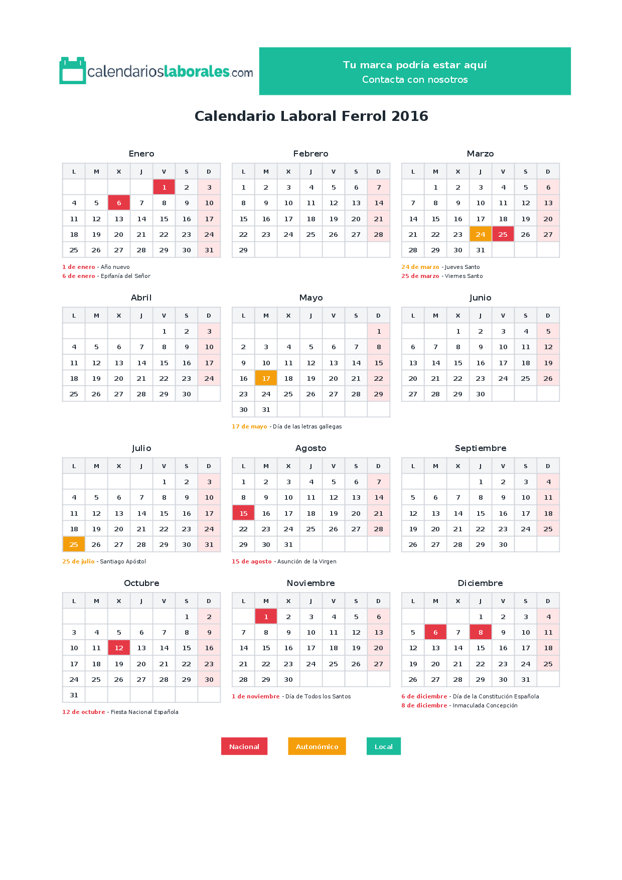 Calendario laboral Ferrol 2016
