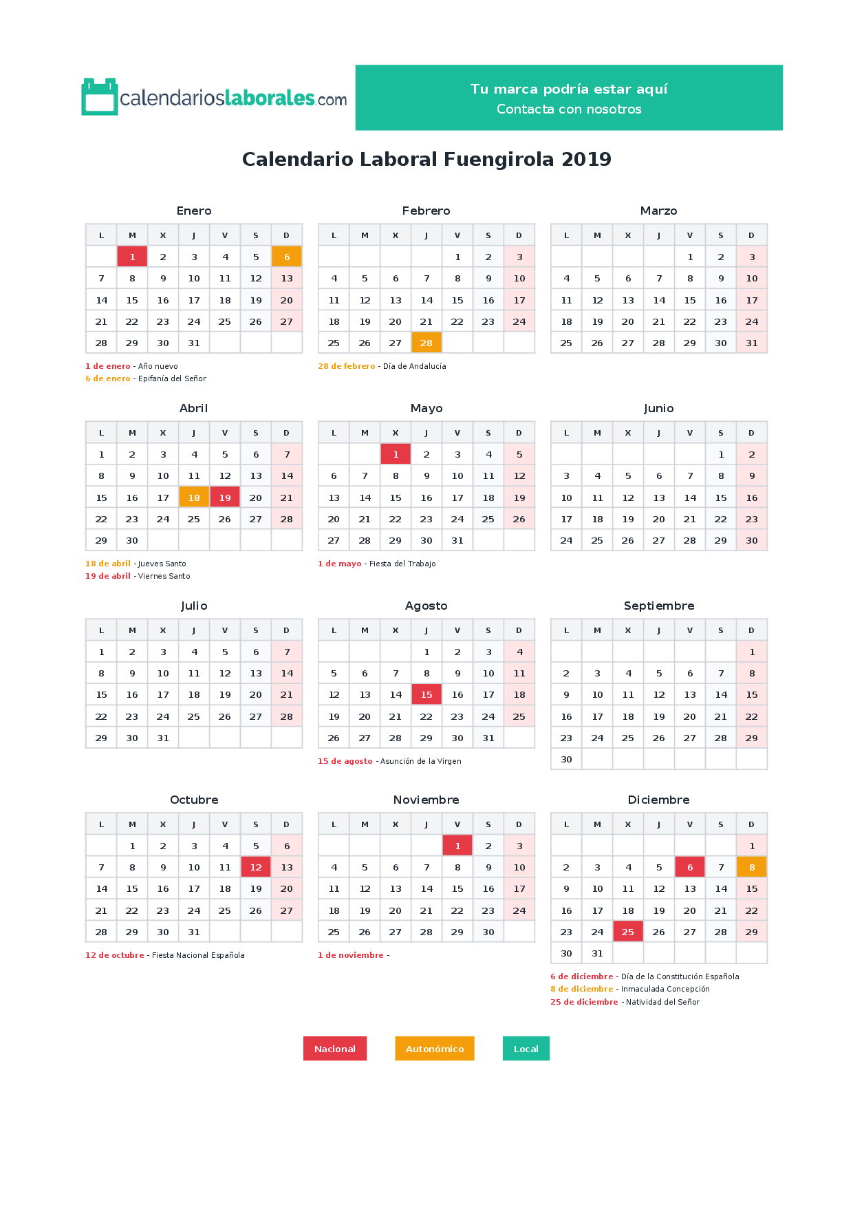 Además, el Ayuntamiento de Fuengirola fija 0 festivos locales que completan el calendario laboral del municipio.