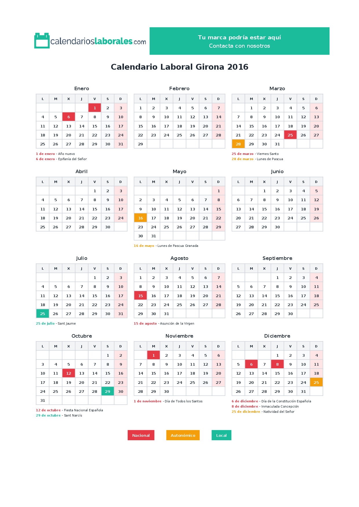 El calendario laboral de Girona en 2016 cuenta con un total de 13 días festivos, que incluyen festivos nacionales, festivos autonómicos de Cataluña y los festivos locales establecidos por cada municipio.