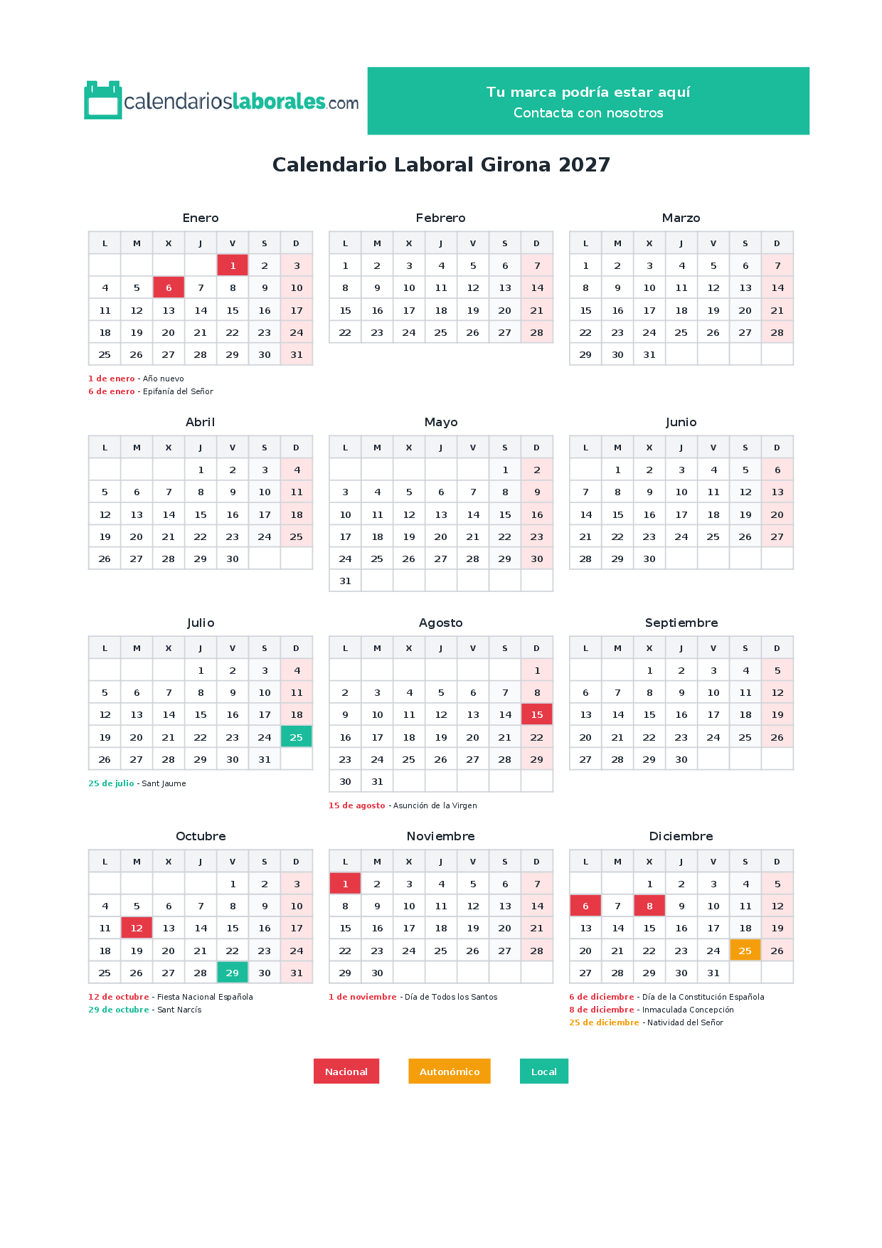 El calendario laboral de Girona en 2027 cuenta con un total de 10 días festivos, que incluyen festivos nacionales, festivos autonómicos de Cataluña y los festivos locales establecidos por cada municipio.