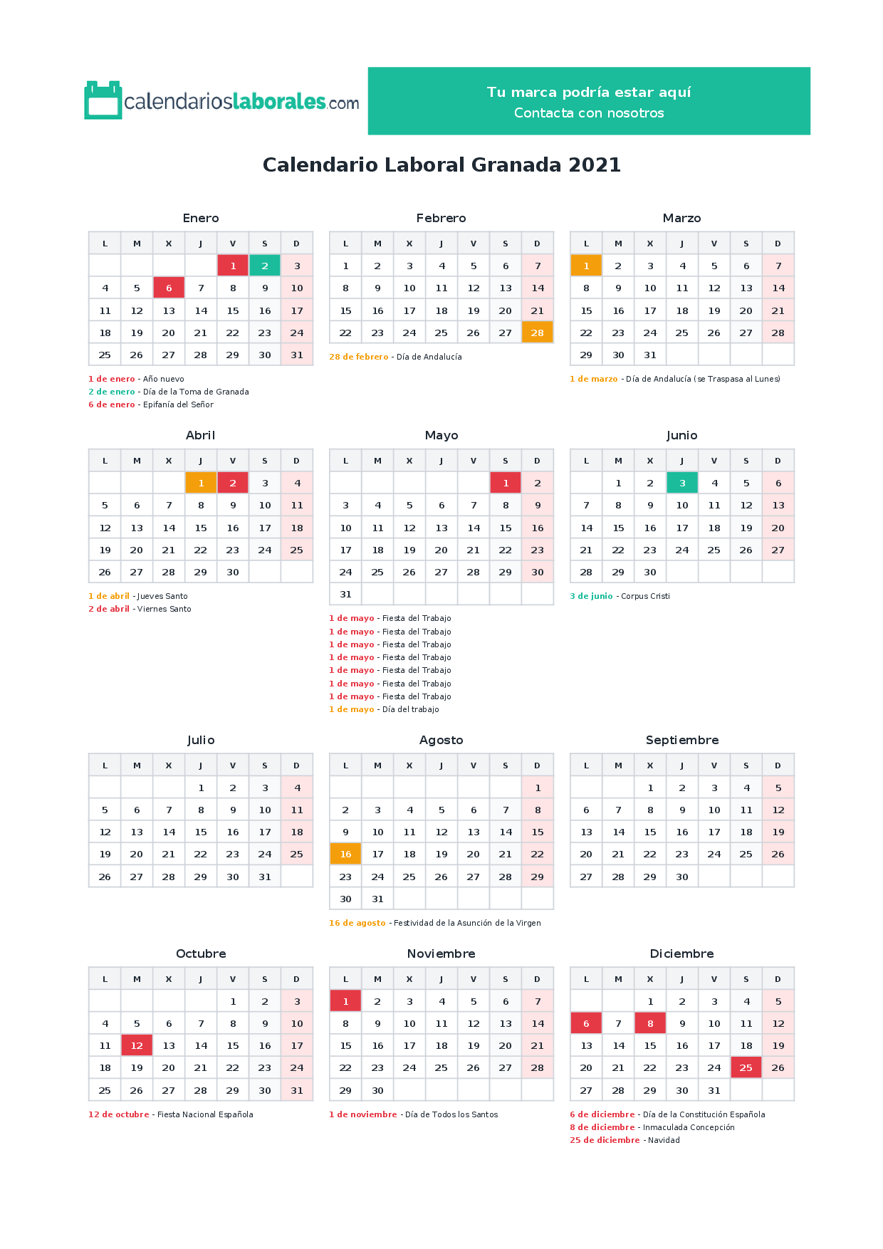 El calendario laboral de Granada en 2021 cuenta con un total de 15 días festivos, que incluyen festivos nacionales, festivos autonómicos de Andalucía y los festivos locales establecidos por cada municipio.