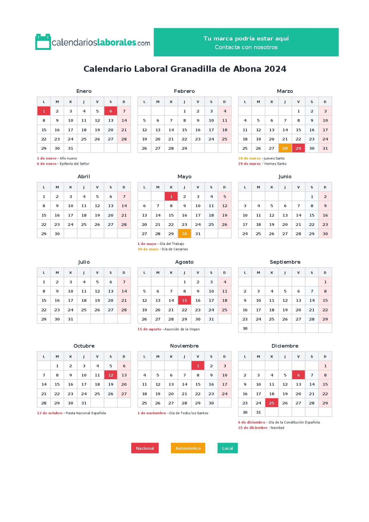 Calendario laboral Granadilla de Abona 2024