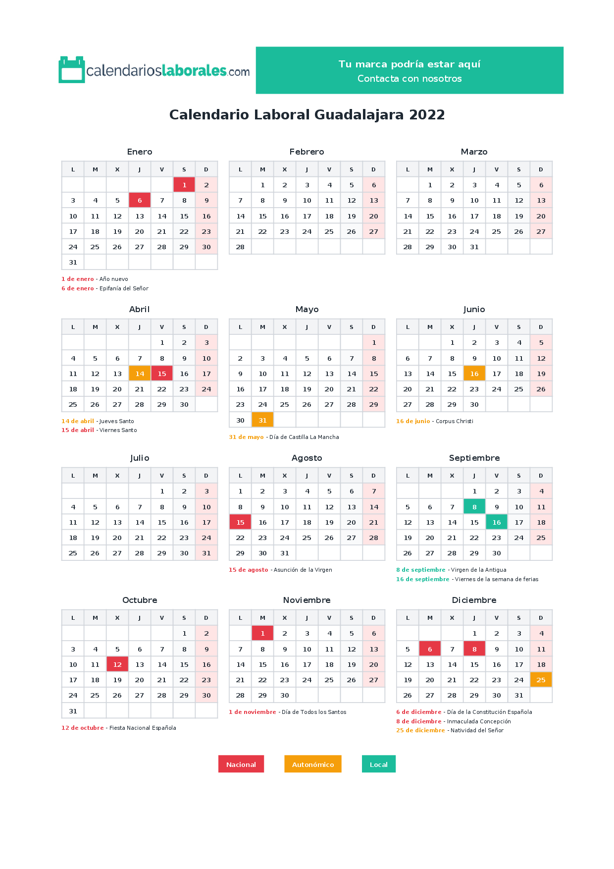 El calendario laboral de Guadalajara en 2022 cuenta con un total de 14 días festivos, que incluyen festivos nacionales, festivos autonómicos de Castilla La Mancha y los festivos locales establecidos por cada municipio.