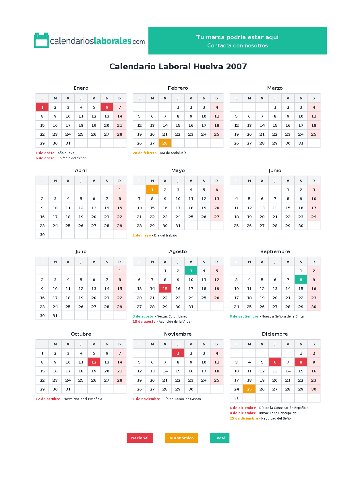 El calendario laboral de Huelva en 2007 cuenta con un total de 12 días festivos, que incluyen festivos nacionales, festivos autonómicos de Andalucía y los festivos locales establecidos por cada municipio.